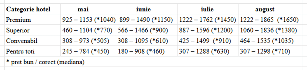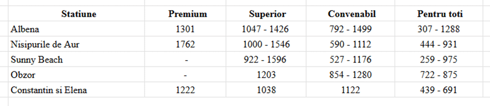 Cat mai costa o vacanta in Bulgaria in 2026 daca o cumper... 2 April 2026 Bulgaria Postat de travel planner Planificarea vacantelor in avans este o strategie preferata de multi dintre turistii romani care doresc sa obtina predictibilitate, cele mai bune preturi si conditii unice de rezervare, iar litoralul bulgaresc se mentine ca fiind una dintre cele mai cautate destinatii in acest sens. In plus, luna aprilie ramane un moment bun pentru achizitionarea unei vacante: scapi de o grija rezervand vacanta pentru la vara si profiti totodata de multiplele avantaje ale early booking-ului. In aceasta pagina vei gasi informatii despre: Pretul unei vacante litoral Bulgaria in early booking apriliePretul unei vacante litoral Bulgaria in functie de categoria hotelului Alte cheltuieli de luat in calcul pentru vacanta pe litoralul bulgaresc Proximitatea fata de casa, serviciile atractive, conditiile bune de cazare, preturile convenabile in cazul ofertelor de tip early booking si mai ales conditiile de rezervare foarte avantajoase – toate reprezinta motive plauzibile pentru alegerea unei vacante pe litoralul din Bulgaria. In cele ce urmeaza gasesti amanunte referitoare la pretul unei vacante pe litoralul bulgaresc in functie de categoria hotelului potrivit pentru tine, in functie de perioada aleasa, in functie de momentul in care o achizitionezi si alte detalii despre costuri extra. Pretul unei vacante litoral Bulgaria in early booking aprilie Achizitionarea unei vacante in perioada de early booking (in cazul de fata – luna aprilie 2026) ofera multiple plusuri, printre care preturile cu pana la 25%, in unele cazuri chiar 30% mai mici, acces la o serie de conditii de rezervare unice, dar si o mai mare siguranta in ceea ce priveste disponibilitatea locurilor (multe dintre hotelurile apreciate se ocupa foarte repede in plin sezon). La Travel Planner, poti alege sa achiti un avans de doar 10% si restul sumei la vara, iar printre beneficii se numara si protectie imbolnavire copil, cel mai bun pret garantat, conditiile superflexibile de rezervare, reduceri de 15% la asigurarile de calatorie, pretul minim, reduceri exclusive in Bulgaria. Atentie, o parte dintre aceste conditii de rezervare pot expira la finalul lunii aprilie. Despre toate acestea poti citi mai multe informatii in articolul: Ce pierzi daca nu achizitionezi vacanta prin early booking Pretul este dictat si de categoria hotelului, dar si de perioada in care alegi sa-ti faci vacanta (aspecte pe care le vom aborda in capitolul urmator), insa per total, daca alegi sa cumperi in early booking aprilie, poti scuti chiar si cateva sute de euro in cazul hotelurilor din categoriile premium si superior. In plus, scapi de o grija cu tot ce inseamna planificarea unei vacante in plin sezon. Prin ofertele early booking ai siguranta pretului, indiferent de scumpirile ulterioare, siguranta locului la hotelul preferat, conditii de rezervare unice, precum avansul de doar 1o% si restul la vara, alaturi de alte beneficii, plus suficient timp la indemana pentru a-ti organiza vacanta in cel mai mic detaliu 🙂 *preturile pentru vacantele in Bulgaria au crescut fata de aceeasi perioada a anului trecut cu procente de circa 5–10%. O noua crestere a preturilor din partea hotelierilor este posibil sa se remarce si in urmatoarele luni. Bulgaria a adoptat moneda euro de la 1 ianuarie, iar aceste reduceri din prezent vin pe fondul inflatiei generate de trecerea la euro. Rezervarile efectuate in aceasta perioada reprezinta un deal bun, respectiv o modalitate de a securiza o vacanta cu niste beneficii utile si care fac diferenta. Pretul unei vacante litoral Bulgaria in functie de categoria hotelului Tariful unei experiente la mare in Bulgaria variaza, in mod evident, in functie de categoria hotelului ales. Pe site-ul travelplanner.ro, utilizatorii au posibilitatea de a selecta dintre 4 categorii de hoteluri, ordonate in functie de calitate: Premium, Superior, Convenabil si Pentru toti. Fiecare dintre acestea a fost atent alcatuita de catre consultantii Travel Planner, in urma experientelor personale, ale turistilor si in urma feedback-ului primit de la clientii Travel Planner. Mai jos gasesti un tabel cu preturi simulate in perioada de early booking aprilie, pentru fiecare dintre cele 4 categorii de hoteluri, pentru o vacanta de 5 nopti, 2 adulti, in diferite perioade ale sezonului cald. Dupa cum se poate observa, daca o achizitionezi in early booking aprilie, o vacanta de 5 nopti pentru 2 persoane in varf de sezon (iulie-august) costa la un hotel premium in jur de 1550 euro, la un hotel superior in jur de 1300 euro, la un hotel convenabil in jur de 950 euro, si la un hotel pentru toti in jur de 670 de euro. ATENTIE, acestea sunt preturile aferente ofertelor de early booking valabile in luna aprilie 2026. * Majoritatea hotelurilor se afla in jurul pretului dintre paranteze, marcat in tabel cu *. Un pret considerabil mai mare de atat poate reflecta o serie de servicii suplimentare sau poate fi, intr-adevar, prea ridicat. Un pret mult prea mic fata de aceasta valoare poate fi un pret realmente foarte bun sau poate reflecta calitatea serviciilor.De aceea, in astfel de situatii, iti recomandam sa ceri mai multe informatii consultantului tau Travel Planner, care prin experienta acumulata te poate indruma catre o alegere potrivita din punct de vedere al raportului calitate/pret. *Preturile sunt exprimate in euro, au fost simulate la data de 2 aprilie 2026 si pot suferi modificari pe parcurs. Spre exemplu, o vacanta de 5 nopti, 2 adulti, in intervalul 01-06 iunie, la Hotel GRIFID Noa de 5 stele (categoria Premium, camera STANDARD) costa, in early booking aprilie, 963 euro, un pret cu 25% mai mic comparativ cu acelasi pachet cumparat in plin sezon. O vacanta de 5 nopti, 2 adulti, in intervalul 12-17 iunie, la Hotel Astoria (ex Riu) Nisipurile de Aur de 4 stele (categoria Superior) costa, in early booking, 1045 euro, un pret cu 10% mai mic comparativ cu acelasi pachet cumparat in 