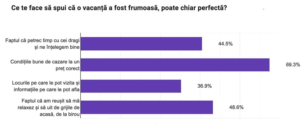 Studiu Travel Planner: Aproximativ 60% dintre români vor ... 3 February 2026 Comunicate de presa Postat de travel planner 40% dintre turiștii români își permit să cheltuiască pentru vacanța principală din acest an între 350 și 500 de euro de persoană, iar 32% între 500 și 1.000 de euro, conform unui studiu realizat de platforma de turism Travel Planner. Studiul s-a desfășurat online în perioada 21-28 ianuarie 2026, iar pentru acesta au răspuns 699 de persoane, femei și bărbați, cu vârsta peste 18 ani. Cercetarea analizează preferințele privind durata vacanțelor, bugetele alocate, destinațiile și serviciile alese, modul de rezervare și caracteristicile unei vacanțe reușite. Aproximativ 91% dintre respondenți spun că au încredere că vor merge în vacanță anul acesta. Cei care nu vor merge în vacanță, cred că nu vor pleca din cauza lipsei banilor (53%), a lipsei de timp (17,7%) pentru că au alte priorități (17,5%) sau din alte motive (11,3%) precum problemele de sănătate. Scapă de-o grijă și rezervă acum vacanța ta în Bulgaria cu doar 10% avans! Oferte early booking Bulgaria De asemenea, datele Travel Planner arată că 39% dintre respondenți plănuiesc să aibă două vacanțe a câte o săptămână anul acesta; aproximativ 37% au de gând să plece în o vacanță de o săptămână; 12% dintre respondenți plănuiesc să plece în mai mult de două vacanțe a câte o săptămână; 7,2% cred că durata vacanței va fi mai scurtă de o săptămână, iar 4% dintre respondenți nu știu în câte vacanțe vor pleca și cât vor dura acestea. Bulgaria, Grecia și alte țări europene – destinațiile preferate ale românilor pentru vacanța principala a acestui an 40% dintre respondenți spun că își permit să cheltuiască 350 – 500 de euro de persoană pentru o săptămână de vacanță, 31% spun că pot plăti între 500 și 1.000 de euro, 17% ar plăti mai puțin de 350 de euro de persoană, 10% ar fi dispuși să plătească între 1.000 și 1.500 de euro, iar 2% ar plăti peste 1.500 de euro. În jur de 54% dintre români și-ar dori să stea 6-7 zile în vacanță, 18% ar sta 9-10 zile, 14% ar sta 4-5 zile, iar 14,1% ar merge peste zece zile în vacanță. În privința destinației, 52% dintre respondenți ar alege Bulgaria pentru vacanța principală din acesta an, 18% ar merge în Grecia, 10,5% în o altă țară europeană; 10,1% ar merge în Turcia; 5,3% ar alege România pentru vacanță, iar 3,7% ar pleca în afara Europei. Cazarea bună la un preț corect – principalul criteriu pentru o vacanță frumoasă. Urmează lipsa de griji și timpul petrecut cu cei dragi Întrebați ce i-ar face să considere vacanța ca fiind frumoasă, poate chiar perfectă, 70% dintre participanții la studiu au amintit despre condițiile bune de cazare la un preț corect; 49% despre relaxare și a reuși să uite de grijile de acasă și de la birou, 44% despre faptul că pot petrece timp de calitate cu cei dragi, iar pentru 37% dintre români sunt importante locurile pe care le pot vizita și informațiile pe care le pot afla în vacanță. De asemenea, 70% dintre respondenți spun că apariția unei probleme legate de cazare ar fi principalul factor care ar strica vacanța. Pe locurile următoare se află îmbolnăvirea unui membru al familiei (58%), probleme legate de transport (31%), neînțelegerile între membrii familiei sau cu grupul de prieteni (15%) și necesitatea de a lucra pentru serviciu (10%). Aproape 60% dintre români vor vacanțe all-inclusive 58% dintre respondenți spun că ar prefera servicii all-inclusive pentru vacanță, 46% ultra all-inclusive, 22% demipensiune, 15% cazare cu mic-dejun, iar 6% fără masă inclusă. În jur de 68% dintre respondenți preferă sa călătorească cu mașina personală, 27% aleg avionul, 4% folosesc autocarul, iar 1,2% aleg trenul. În privința rezervărilor, peste 60% dintre respondenți își cumpărară vacanțele în perioada de early booking (39% dintre români își rezervă vacanța cu aproximativ 6 luni înainte, iar 22% rezervă cu 9 luni înainte), 20% fac rezervări cu 3–4 luni înainte, 11% cu 2 luni înainte, iar 7,8% aleg vacanțele cu doar câteva zile înainte (last minute). Principalele motive pentru care turiștii aleg aleg pachetele early booking sunt prețurile mai mici (65%); faptul ca pot profita de anumite avantaje sau bonusuri (plata în rate, upgrade), confortul că vacanța a fost deja planificată (35%) și posibilitatea de a alege dintre cele mai bune opțiuni de cazare si destinații (25%). „Studiul ne arată că românii își doresc să meargă în vacanță și vor face acest lucru, dar vor fi foarte atenți la prețurile pe care le plătesc pentru serviciile oferite. De asemenea, observăm că proximitatea, accesibilitatea și costurile predictibile sunt factorii decisivi în alegerea destinației de vacantă. O altă tendință pe care o vedem este maturizarea comportamentului de rezervare. Peste 60% dintre respondenți spun că aleg oferte de early booking, ceea ce indică o nevoie crescută de siguranță și control al costurilor”, a afirmat Sebastian Constantinescu, fondator și CEO al Travel Planner. Pentru perioada de early booking compania a lansat servicii precum rezervare cu 50 de euro avans, plata în rate, posibilitatea de anulare cu maximum șapte zile înainte de inceputul vacanței și protecție dacă se îmbolnăvesc copiii prin utilizarea unui voucher pentru zilele de cazare neefectuate Travel Planner este o platformă de turism fondată în 2007 de Sebastian Constantinescu și care oferă vacanțe în Bulgaria, Grecia și Turcia. De-a lungul anilor, Travel Planner s-a specializat pe vacanțe cu destinația Bulgaria. În cei 18 ani de lansare, Travel Planner a avut peste 500.000 de clienți pentru sejururi în țara vecină, peste 97% dintre clienți recomandând serviciile companiei.