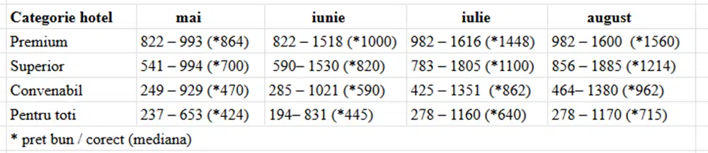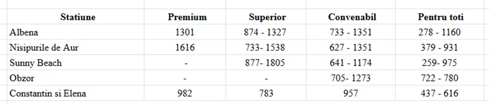 Cat mai costa o vacanta in Bulgaria in 2026 daca o cumperi din februarie 3 February 2026 Bulgaria Postat de travel planner Planificarea vacantelor in avans este o strategie preferata de multi dintre turistii romani care doresc sa obtina predictibilitate, cele mai bune preturi si conditii unice de rezervare, iar litoralul bulgaresc ramane una dintre cele mai cautate destinatii in acest sens. In plus, luna februarie poate fi un moment bun pentru achizitionarea unei vacante: scapi de o grija rezervand vacanta pentru la vara si profiti totodata de multiplele avantaje ale early booking-ului. In aceasta pagina vei gasi informatii despre: Pretul unei vacante litoral Bulgaria in early booking februariePretul unei vacante litoral Bulgaria in functie de categoria hotelului Alte cheltuieli de luat in calcul pentru vacanta pe litoralul bulgaresc Proximitatea fata de casa, serviciile atractive, conditiile bune de cazare, preturile convenabile in cazul ofertelor de tip early booking si mai ales conditiile de rezervare foarte avantajoase – toate reprezinta motive plauzibile pentru alegerea unei vacante pe litoralul din Bulgaria. In cele ce urmeaza gasesti amanunte referitoare la pretul unei vacante pe litoralul bulgaresc in functie de categoria hotelului potrivit pentru tine, in functie de perioada aleasa, in functie de momentul in care o achizitionezi si alte detalii despre costuri extra. Pretul unei vacante litoral Bulgaria in early booking februarie Achizitionarea unei vacante in perioada de early booking (in cazul de fata – luna februarie 2026) ofera multiple plusuri, printre care preturile cu pana la 30%, in unele cazuri chiar 35-40% mai mici, acces la o serie de conditii de rezervare unice, dar si o mai mare siguranta in ceea ce priveste disponibilitatea locurilor (multe dintre hotelurile apreciate se ocupa foarte repede in plin sezon). La Travel Planner, poti alege sa achiti un avans de doar 10% si restul sumei la vara, iar printre beneficii se numara si protectie imbolnavire copil, cel mai bun pret garantat, conditiile superflexibile de rezervare, reduceri de 15% la asigurarile de calatorie, pretul minim, reduceri exclusive in Bulgaria. Atentie, o parte dintre aceste conditii de rezervare expira la finalul lunii februarie. Despre toate acestea poti citi mai multe informatii in articolul: Ce pierzi daca nu achizitionezi vacanta prin early booking Pretul este dictat si de categoria hotelului, dar si de perioada in care alegi sa-ti faci vacanta (aspecte pe care le vom aborda in capitolul urmator), insa per total, daca alegi sa cumperi in early booking februarie, poti scuti chiar si cateva sute de euro in cazul hotelurilor din categoriile premium si superior. In plus, scapi de o grija cu tot ce inseamna planificarea unei vacante in plin sezon. Prin ofertele early booking ai siguranta pretului, indiferent de scumpirile ulterioare, siguranta locului la hotelul preferat, conditii de rezervare unice, precum avansul de doar 1o% si restul la vara, alaturi de alte beneficii, plus suficient timp la indemana pentru a-ti organiza vacanta in cel mai mic detaliu 🙂 *preturile pentru vacantele in Bulgaria au crescut fata de aceeasi perioada a anului trecut cu procente de circa 5–10%. O noua crestere a preturilor din partea hotelierilor este posibil sa se remarce si in primavara. Bulgaria a adoptat moneda euro de la 1 ianuarie, iar aceste reduceri din prezent vin pe fondul inflatiei generate de trecerea la euro. Rezervarile efectuate in aceasta perioada reprezinta un deal bun, respectiv o modalitate de a securiza o vacanta cu niste beneficii utile si care fac diferenta. Pretul unei vacante litoral Bulgaria in functie de categoria hotelului Tariful unei experiente la mare in Bulgaria variaza, in mod evident, in functie de categoria hotelului ales. Pe site-ul travelplanner.ro, utilizatorii au posibilitatea de a selecta dintre 4 categorii de hoteluri, ordonate in functie de calitate: Premium, Superior, Convenabil si Pentru toti. Fiecare dintre acestea a fost atent alcatuita de catre consultantii Travel Planner, in urma experientelor personale, ale turistilor si in urma feedback-ului primit de la clientii Travel Planner. Mai jos gasesti un tabel cu preturi simulate in perioada de early booking februarie, pentru fiecare dintre cele 4 categorii de hoteluri, pentru o vacanta de 5 nopti, 2 adulti, in diferite perioade ale sezonului cald. Dupa cum se poate observa, daca o achizitionezi in early booking februarie, o vacanta de 5 nopti pentru 2 persoane in varf de sezon (iulie-august) costa la un hotel premium in jur de 1500 euro, la un hotel superior in jur de 1150 euro, la un hotel convenabil in jur de 900 euro, si la un hotel pentru toti in jur de 670 de euro. ATENTIE, acestea sunt preturile aferente ofertelor de early booking valabile pana la finalul lunii februarie 2026. * Majoritatea hotelurilor se afla in jurul pretului dintre paranteze, marcat in tabel cu *. Un pret considerabil mai mare de atat poate reflecta o serie de servicii suplimentare sau poate fi, intr-adevar, prea ridicat. Un pret mult prea mic fata de aceasta valoare poate fi un pret realmente foarte bun sau poate reflecta calitatea serviciilor.De aceea, in astfel de situatii, iti recomandam sa ceri mai multe informatii consultantului tau Travel Planner, care prin experienta acumulata te poate indruma catre o alegere potrivita din punct de vedere al raportului calitate/pret. *Preturile sunt exprimate in euro, au fost simulate la data de 3 februarie 2026 si pot suferi modificari pe parcurs. Spre exemplu, o vacanta de 5 nopti, 2 adulti, in intervalul 01-06 iunie, la Hotel GRIFID Noa de 5 stele (categoria Premium, camera DELUXE) costa, in early booking februarie, 1253 euro, un pret cu 36% mai mic comparativ cu acelasi pachet cumparat in plin sezon. O vacanta de 5 nopti, 2 adulti, in intervalul 12-17 iunie, la Hotel Astoria (ex Riu) Nisipurile de Aur de 4 stele (categoria Superior) costa, in early booking, 873 euro, un pret cu 24% mai mic comparativ 