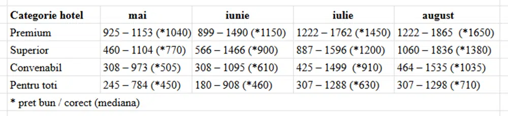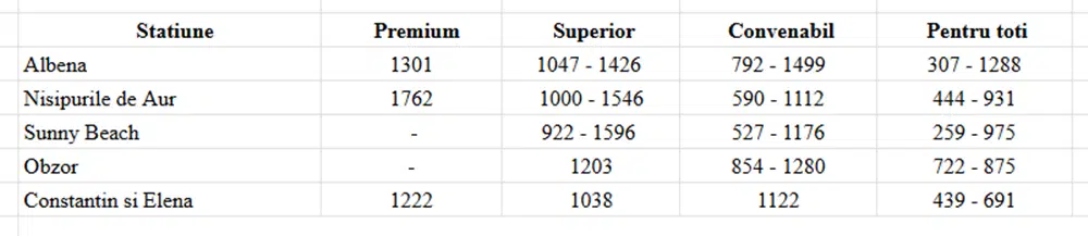 Cat mai costa o vacanta in Bulgaria in 2026 daca o cumperi din aprilie 2 April 2026 Bulgaria Postat de travel planner Planificarea vacantelor in avans este o strategie preferata de multi dintre turistii romani care doresc sa obtina predictibilitate, cele mai bune preturi si conditii unice de rezervare, iar litoralul bulgaresc se mentine ca fiind una dintre cele mai cautate destinatii in acest sens. In plus, luna aprilie ramane un moment bun pentru achizitionarea unei vacante: scapi de o grija rezervand vacanta pentru la vara si profiti totodata de multiplele avantaje ale early booking-ului. In aceasta pagina vei gasi informatii despre: Pretul unei vacante litoral Bulgaria in early booking apriliePretul unei vacante litoral Bulgaria in functie de categoria hotelului Alte cheltuieli de luat in calcul pentru vacanta pe litoralul bulgaresc Proximitatea fata de casa, serviciile atractive, conditiile bune de cazare, preturile convenabile in cazul ofertelor de tip early booking si mai ales conditiile de rezervare foarte avantajoase – toate reprezinta motive plauzibile pentru alegerea unei vacante pe litoralul din Bulgaria. In cele ce urmeaza gasesti amanunte referitoare la pretul unei vacante pe litoralul bulgaresc in functie de categoria hotelului potrivit pentru tine, in functie de perioada aleasa, in functie de momentul in care o achizitionezi si alte detalii despre costuri extra. Pretul unei vacante litoral Bulgaria in early booking aprilie Achizitionarea unei vacante in perioada de early booking (in cazul de fata – luna aprilie 2026) ofera multiple plusuri, printre care preturile cu pana la 25%, in unele cazuri chiar 30% mai mici, acces la o serie de conditii de rezervare unice, dar si o mai mare siguranta in ceea ce priveste disponibilitatea locurilor (multe dintre hotelurile apreciate se ocupa foarte repede in plin sezon). La Travel Planner, poti alege sa achiti un avans de doar 10% si restul sumei la vara, iar printre beneficii se numara si protectie imbolnavire copil, cel mai bun pret garantat, conditiile superflexibile de rezervare, reduceri de 15% la asigurarile de calatorie, pretul minim, reduceri exclusive in Bulgaria. Atentie, o parte dintre aceste conditii de rezervare pot expira la finalul lunii aprilie. Despre toate acestea poti citi mai multe informatii in articolul: Ce pierzi daca nu achizitionezi vacanta prin early booking Pretul este dictat si de categoria hotelului, dar si de perioada in care alegi sa-ti faci vacanta (aspecte pe care le vom aborda in capitolul urmator), insa per total, daca alegi sa cumperi in early booking aprilie, poti scuti chiar si cateva sute de euro in cazul hotelurilor din categoriile premium si superior. In plus, scapi de o grija cu tot ce inseamna planificarea unei vacante in plin sezon. Prin ofertele early booking ai siguranta pretului, indiferent de scumpirile ulterioare, siguranta locului la hotelul preferat, conditii de rezervare unice, precum avansul de doar 1o% si restul la vara, alaturi de alte beneficii, plus suficient timp la indemana pentru a-ti organiza vacanta in cel mai mic detaliu 🙂 *preturile pentru vacantele in Bulgaria au crescut fata de aceeasi perioada a anului trecut cu procente de circa 5–10%. O noua crestere a preturilor din partea hotelierilor este posibil sa se remarce si in urmatoarele luni. Bulgaria a adoptat moneda euro de la 1 ianuarie, iar aceste reduceri din prezent vin pe fondul inflatiei generate de trecerea la euro. Rezervarile efectuate in aceasta perioada reprezinta un deal bun, respectiv o modalitate de a securiza o vacanta cu niste beneficii utile si care fac diferenta. Pretul unei vacante litoral Bulgaria in functie de categoria hotelului Tariful unei experiente la mare in Bulgaria variaza, in mod evident, in functie de categoria hotelului ales. Pe site-ul travelplanner.ro, utilizatorii au posibilitatea de a selecta dintre 4 categorii de hoteluri, ordonate in functie de calitate: Premium, Superior, Convenabil si Pentru toti. Fiecare dintre acestea a fost atent alcatuita de catre consultantii Travel Planner, in urma experientelor personale, ale turistilor si in urma feedback-ului primit de la clientii Travel Planner. Mai jos gasesti un tabel cu preturi simulate in perioada de early booking aprilie, pentru fiecare dintre cele 4 categorii de hoteluri, pentru o vacanta de 5 nopti, 2 adulti, in diferite perioade ale sezonului cald. Dupa cum se poate observa, daca o achizitionezi in early booking aprilie, o vacanta de 5 nopti pentru 2 persoane in varf de sezon (iulie-august) costa la un hotel premium in jur de 1550 euro, la un hotel superior in jur de 1300 euro, la un hotel convenabil in jur de 950 euro, si la un hotel pentru toti in jur de 670 de euro. ATENTIE, acestea sunt preturile aferente ofertelor de early booking valabile in luna aprilie 2026. * Majoritatea hotelurilor se afla in jurul pretului dintre paranteze, marcat in tabel cu *. Un pret considerabil mai mare de atat poate reflecta o serie de servicii suplimentare sau poate fi, intr-adevar, prea ridicat. Un pret mult prea mic fata de aceasta valoare poate fi un pret realmente foarte bun sau poate reflecta calitatea serviciilor.De aceea, in astfel de situatii, iti recomandam sa ceri mai multe informatii consultantului tau Travel Planner, care prin experienta acumulata te poate indruma catre o alegere potrivita din punct de vedere al raportului calitate/pret. *Preturile sunt exprimate in euro, au fost simulate la data de 2 aprilie 2026 si pot suferi modificari pe parcurs. Spre exemplu, o vacanta de 5 nopti, 2 adulti, in intervalul 01-06 iunie, la Hotel GRIFID Noa de 5 stele (categoria Premium, camera STANDARD) costa, in early booking aprilie, 963 euro, un pret cu 25% mai mic comparativ cu acelasi pachet cumparat in plin sezon. O vacanta de 5 nopti, 2 adulti, in intervalul 12-17 iunie, la Hotel Astoria (ex Riu) Nisipurile de Aur de 4 stele (categoria Superior) costa, in early booking, 1045 euro, un pret cu 10% mai mic comparativ cu acelasi pachet cu