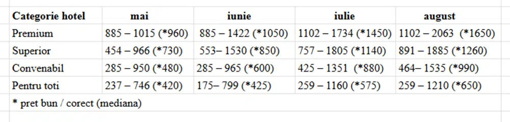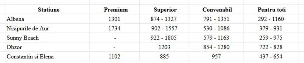 Cat mai costa o vacanta in Bulgaria in 2026 daca o cumperi din martie 2 March 2026 Bulgaria Postat de travel planner Planificarea vacantelor in avans este o strategie preferata de multi dintre turistii romani care doresc sa obtina predictibilitate, cele mai bune preturi si conditii unice de rezervare, iar litoralul bulgaresc ramane una dintre cele mai cautate destinatii in acest sens. In plus, luna martie poate fi un moment bun pentru achizitionarea unei vacante: scapi de o grija rezervand vacanta pentru la vara si profiti totodata de multiplele avantaje ale early booking-ului. In aceasta pagina vei gasi informatii despre: Pretul unei vacante litoral Bulgaria in early booking martiePretul unei vacante litoral Bulgaria in functie de categoria hotelului Alte cheltuieli de luat in calcul pentru vacanta pe litoralul bulgaresc Proximitatea fata de casa, serviciile atractive, conditiile bune de cazare, preturile convenabile in cazul ofertelor de tip early booking si mai ales conditiile de rezervare foarte avantajoase – toate reprezinta motive plauzibile pentru alegerea unei vacante pe litoralul din Bulgaria. In cele ce urmeaza gasesti amanunte referitoare la pretul unei vacante pe litoralul bulgaresc in functie de categoria hotelului potrivit pentru tine, in functie de perioada aleasa, in functie de momentul in care o achizitionezi si alte detalii despre costuri extra. Pretul unei vacante litoral Bulgaria in early booking martie Achizitionarea unei vacante in perioada de early booking (in cazul de fata – luna martie 2026) ofera multiple plusuri, printre care preturile cu pana la 25%, in unele cazuri chiar 30% mai mici, acces la o serie de conditii de rezervare unice, dar si o mai mare siguranta in ceea ce priveste disponibilitatea locurilor (multe dintre hotelurile apreciate se ocupa foarte repede in plin sezon). La Travel Planner, poti alege sa achiti un avans de doar 10% si restul sumei la vara, iar printre beneficii se numara si protectie imbolnavire copil, cel mai bun pret garantat, conditiile superflexibile de rezervare, reduceri de 15% la asigurarile de calatorie, pretul minim, reduceri exclusive in Bulgaria. Atentie, o parte dintre aceste conditii de rezervare expira la finalul lunii martie. Despre toate acestea poti citi mai multe informatii in articolul: Ce pierzi daca nu achizitionezi vacanta prin early booking Pretul este dictat si de categoria hotelului, dar si de perioada in care alegi sa-ti faci vacanta (aspecte pe care le vom aborda in capitolul urmator), insa per total, daca alegi sa cumperi in early booking martie, poti scuti chiar si cateva sute de euro in cazul hotelurilor din categoriile premium si superior. In plus, scapi de o grija cu tot ce inseamna planificarea unei vacante in plin sezon. Prin ofertele early booking ai siguranta pretului, indiferent de scumpirile ulterioare, siguranta locului la hotelul preferat, conditii de rezervare unice, precum avansul de doar 1o% si restul la vara, alaturi de alte beneficii, plus suficient timp la indemana pentru a-ti organiza vacanta in cel mai mic detaliu 🙂 *preturile pentru vacantele in Bulgaria au crescut fata de aceeasi perioada a anului trecut cu procente de circa 5–10%. O noua crestere a preturilor din partea hotelierilor este posibil sa se remarce si in urmatoarele luni de primavara. Bulgaria a adoptat moneda euro de la 1 ianuarie, iar aceste reduceri din prezent vin pe fondul inflatiei generate de trecerea la euro. Rezervarile efectuate in aceasta perioada reprezinta un deal bun, respectiv o modalitate de a securiza o vacanta cu niste beneficii utile si care fac diferenta. Pretul unei vacante litoral Bulgaria in functie de categoria hotelului Tariful unei experiente la mare in Bulgaria variaza, in mod evident, in functie de categoria hotelului ales. Pe site-ul travelplanner.ro, utilizatorii au posibilitatea de a selecta dintre 4 categorii de hoteluri, ordonate in functie de calitate: Premium, Superior, Convenabil si Pentru toti. Fiecare dintre acestea a fost atent alcatuita de catre consultantii Travel Planner, in urma experientelor personale, ale turistilor si in urma feedback-ului primit de la clientii Travel Planner. Mai jos gasesti un tabel cu preturi simulate in perioada de early booking martie, pentru fiecare dintre cele 4 categorii de hoteluri, pentru o vacanta de 5 nopti, 2 adulti, in diferite perioade ale sezonului cald. Dupa cum se poate observa, daca o achizitionezi in early booking martie, o vacanta de 5 nopti pentru 2 persoane in varf de sezon (iulie-august) costa la un hotel premium in jur de 1500 euro, la un hotel superior in jur de 1150 euro, la un hotel convenabil in jur de 900 euro, si la un hotel pentru toti in jur de 670 de euro. ATENTIE, acestea sunt preturile aferente ofertelor de early booking valabile in luna martie 2026. * Majoritatea hotelurilor se afla in jurul pretului dintre paranteze, marcat in tabel cu *. Un pret considerabil mai mare de atat poate reflecta o serie de servicii suplimentare sau poate fi, intr-adevar, prea ridicat. Un pret mult prea mic fata de aceasta valoare poate fi un pret realmente foarte bun sau poate reflecta calitatea serviciilor.De aceea, in astfel de situatii, iti recomandam sa ceri mai multe informatii consultantului tau Travel Planner, care prin experienta acumulata te poate indruma catre o alegere potrivita din punct de vedere al raportului calitate/pret. *Preturile sunt exprimate in euro, au fost simulate la data de 2 martie 2026 si pot suferi modificari pe parcurs. Spre exemplu, o vacanta de 5 nopti, 2 adulti, in intervalul 01-06 iunie, la Hotel GRIFID Noa de 5 stele (categoria Premium, camera DELUXE) costa, in early booking martie, 1385 euro, un pret cu 20% mai mic comparativ cu acelasi pachet cumparat in plin sezon. O vacanta de 5 nopti, 2 adulti, in intervalul 12-17 iunie, la Hotel Astoria (ex Riu) Nisipurile de Aur de 4 stele (categoria Superior) costa, in early booking, 974 euro, un pret cu 15% mai mic comparativ cu acelasi pachet cumparat in plin s