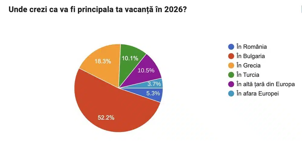 Studiu Travel Planner: Aproximativ 60% dintre români vor vacanțe all-inclusive 3 February 2026 Comunicate de presa Postat de travel planner 40% dintre turiștii români își permit să cheltuiască pentru vacanța principală din acest an între 350 și 500 de euro de persoană, iar 32% între 500 și 1.000 de euro, conform unui studiu realizat de platforma de turism Travel Planner. Studiul s-a desfășurat online în perioada 21-28 ianuarie 2026, iar pentru acesta au răspuns 699 de persoane, femei și bărbați, cu vârsta peste 18 ani. Cercetarea analizează preferințele privind durata vacanțelor, bugetele alocate, destinațiile și serviciile alese, modul de rezervare și caracteristicile unei vacanțe reușite. Aproximativ 91% dintre respondenți spun că au încredere că vor merge în vacanță anul acesta. Cei care nu vor merge în vacanță, cred că nu vor pleca din cauza lipsei banilor (53%), a lipsei de timp (17,7%) pentru că au alte priorități (17,5%) sau din alte motive (11,3%) precum problemele de sănătate. Scapă de-o grijă și rezervă acum vacanța ta în Bulgaria cu doar 10% avans! Oferte early booking Bulgaria De asemenea, datele Travel Planner arată că 39% dintre respondenți plănuiesc să aibă două vacanțe a câte o săptămână anul acesta; aproximativ 37% au de gând să plece în o vacanță de o săptămână; 12% dintre respondenți plănuiesc să plece în mai mult de două vacanțe a câte o săptămână; 7,2% cred că durata vacanței va fi mai scurtă de o săptămână, iar 4% dintre respondenți nu știu în câte vacanțe vor pleca și cât vor dura acestea. Bulgaria, Grecia și alte țări europene – destinațiile preferate ale românilor pentru vacanța principala a acestui an 40% dintre respondenți spun că își permit să cheltuiască 350 – 500 de euro de persoană pentru o săptămână de vacanță, 31% spun că pot plăti între 500 și 1.000 de euro, 17% ar plăti mai puțin de 350 de euro de persoană, 10% ar fi dispuși să plătească între 1.000 și 1.500 de euro, iar 2% ar plăti peste 1.500 de euro. În jur de 54% dintre români și-ar dori să stea 6-7 zile în vacanță, 18% ar sta 9-10 zile, 14% ar sta 4-5 zile, iar 14,1% ar merge peste zece zile în vacanță. În privința destinației, 52% dintre respondenți ar alege Bulgaria pentru vacanța principală din acesta an, 18% ar merge în Grecia, 10,5% în o altă țară europeană; 10,1% ar merge în Turcia; 5,3% ar alege România pentru vacanță, iar 3,7% ar pleca în afara Europei. Cazarea bună la un preț corect – principalul criteriu pentru o vacanță frumoasă. Urmează lipsa de griji și timpul petrecut cu cei dragi Întrebați ce i-ar face să considere vacanța ca fiind frumoasă, poate chiar perfectă, 70% dintre participanții la studiu au amintit despre condițiile bune de cazare la un preț corect; 49% despre relaxare și a reuși să uite de grijile de acasă și de la birou, 44% despre faptul că pot petrece timp de calitate cu cei dragi, iar pentru 37% dintre români sunt importante locurile pe care le pot vizita și informațiile pe care le pot afla în vacanță. De asemenea, 70% dintre respondenți spun că apariția unei probleme legate de cazare ar fi principalul factor care ar strica vacanța. Pe locurile următoare se află îmbolnăvirea unui membru al familiei (58%), probleme legate de transport (31%), neînțelegerile între membrii familiei sau cu grupul de prieteni (15%) și necesitatea de a lucra pentru serviciu (10%). Aproape 60% dintre români vor vacanțe all-inclusive 58% dintre respondenți spun că ar prefera servicii all-inclusive pentru vacanță, 46% ultra all-inclusive, 22% demipensiune, 15% cazare cu mic-dejun, iar 6% fără masă inclusă. În jur de 68% dintre respondenți preferă sa călătorească cu mașina personală, 27% aleg avionul, 4% folosesc autocarul, iar 1,2% aleg trenul. În privința rezervărilor, peste 60% dintre respondenți își cumpărară vacanțele în perioada de early booking (39% dintre români își rezervă vacanța cu aproximativ 6 luni înainte, iar 22% rezervă cu 9 luni înainte), 20% fac rezervări cu 3–4 luni înainte, 11% cu 2 luni înainte, iar 7,8% aleg vacanțele cu doar câteva zile înainte (last minute). Principalele motive pentru care turiștii aleg aleg pachetele early booking sunt prețurile mai mici (65%); faptul ca pot profita de anumite avantaje sau bonusuri (plata în rate, upgrade), confortul că vacanța a fost deja planificată (35%) și posibilitatea de a alege dintre cele mai bune opțiuni de cazare si destinații (25%). „Studiul ne arată că românii își doresc să meargă în vacanță și vor face acest lucru, dar vor fi foarte atenți la prețurile pe care le plătesc pentru serviciile oferite. De asemenea, observăm că proximitatea, accesibilitatea și costurile predictibile sunt factorii decisivi în alegerea destinației de vacantă. O altă tendință pe care o vedem este maturizarea comportamentului de rezervare. Peste 60% dintre respondenți spun că aleg oferte de early booking, ceea ce indică o nevoie crescută de siguranță și control al costurilor”, a afirmat Sebastian Constantinescu, fondator și CEO al Travel Planner. Pentru perioada de early booking compania a lansat servicii precum rezervare cu 50 de euro avans, plata în rate, posibilitatea de anulare cu maximum șapte zile înainte de inceputul vacanței și protecție dacă se îmbolnăvesc copiii prin utilizarea unui voucher pentru zilele de cazare neefectuate Travel Planner este o platformă de turism fondată în 2007 de Sebastian Constantinescu și care oferă vacanțe în Bulgaria, Grecia și Turcia. De-a lungul anilor, Travel Planner s-a specializat pe vacanțe cu destinația Bulgaria. În cei 18 ani de lansare, Travel Planner a avut peste 500.000 de clienți pentru sejururi în țara vecină, peste 97% dintre clienți recomandând serviciile companiei.