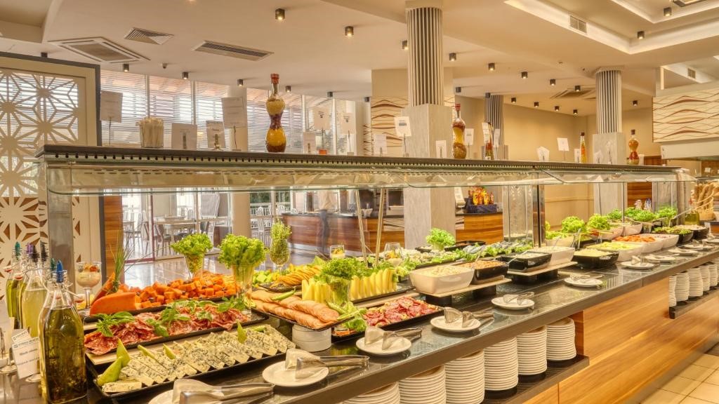 Restaurant principal bufet (pentru oaspetii din cladirile principale), restaurant principal Premium (pentru oaspetii din cladirea Premium), trei restaurante a la carte (asiatic, italian si mexican), lobby bar, snack bar, pool bar, beach bar, Rainy bar, bar saloon. Restaurantele dispun de meniu pentru copii (doar la cina, tip bufet).