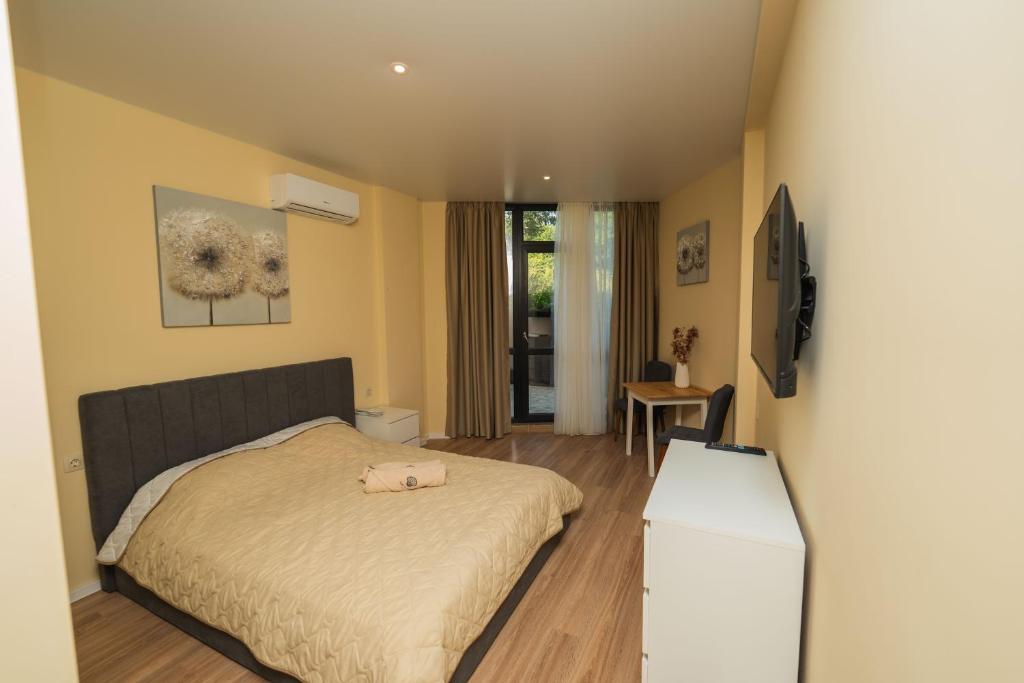 Este un hotel bunicel cu mari probleme de management. Asa se intampla cand proprietarul hotelului traieste cu falsa impresie ca are veleitati de manager hotelier. Aveam niste apa si fructe pe care le-am pus in frigiderul (minibarul) din camera. A doua zi le-am gasit scoase si ma amenintau cu amenda de 50 leva ca le-am folosit minibarul pe post de frigider. Managementul interzice sa aduceti orice fel de mancare sau bautura in camerele de hotel. Am cerut explicatii, dar "doamna manager" nu considera ca e important sa cunoasca macar o limba de circulatie internationala. Toate mesajele din camere, hotel, restaurant sunt in bulgara, rusa, germana si engleza. Daca nu cunoasteti una dintre aceste limbi e bine sa va reorientati, deoarece nimeni nu va poate ajuta, nici macar la alegerea felului de mancare. Nu a constituit o problema pentru noi, dar parintilor veniti pentru 2 nopti le-ar fi fost greu sa comunice cu cineva, in lipsa noastra. Angajatii s-ar potrivi mai bine intr-un "impinge tava", dar cred ca asta e universal valabil in Bulgaria. Hotelul e nou, camerele sunt frumoase si spatioase, balcoanele destul de mari si toate camerele au vedere catre mare. Oricum privelistea e blocata de o multitudine de constructii neterminate, macarale si alte resturi ce amintesc de revolutia industriala. Meniul interesant, dar putin pretentios pentru gusturile mele. E o chestie subiectiva, dar noi nu prea consumam susan prajit, stafide si gemuri langa o feliuta de carne frumos aranjata pe o farfurie frumos manjita cu un sos viu colorat. In ciuda faptului ca aveam mesajul "Do not disturb!" pe clanta usii, femeia de serviciu a vrut sa faca menajul la ora 15.00, cand copilul dormea. Bine totusi ca au facut curat, deoarece in camera parintilor nu s-au obosit sa intre, chiar daca au stat doua nopti. Hotelul e ok, amplasarea e buna pentru cei care doresc liniste, nu e localizat in Nisipurile de Aur, ci in Chaika, e buna miscarea pe scari pana la plaja si inapoi, dar serviciile si personalul jale.
