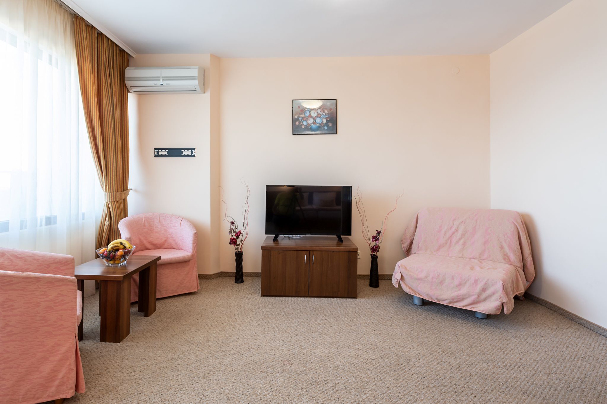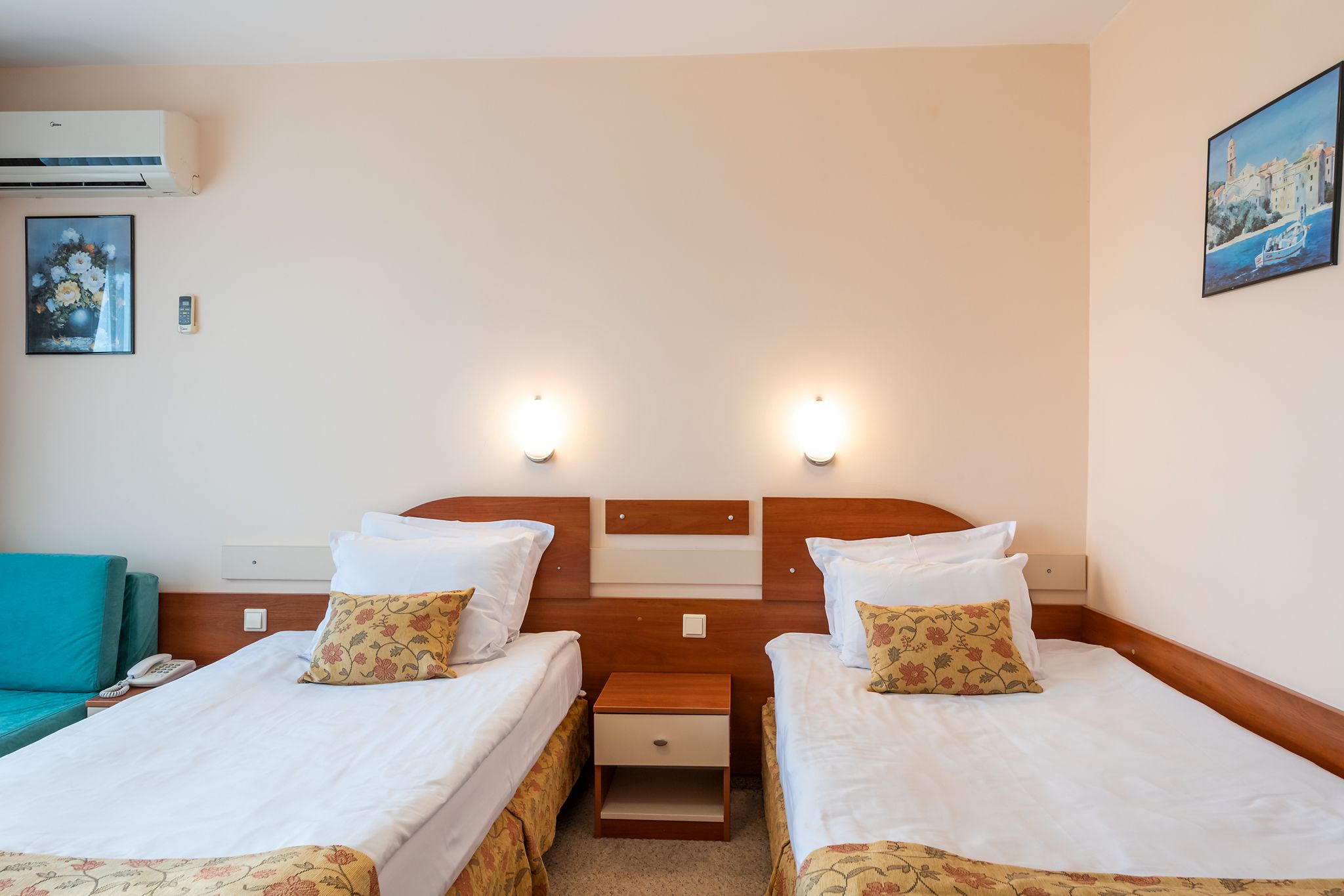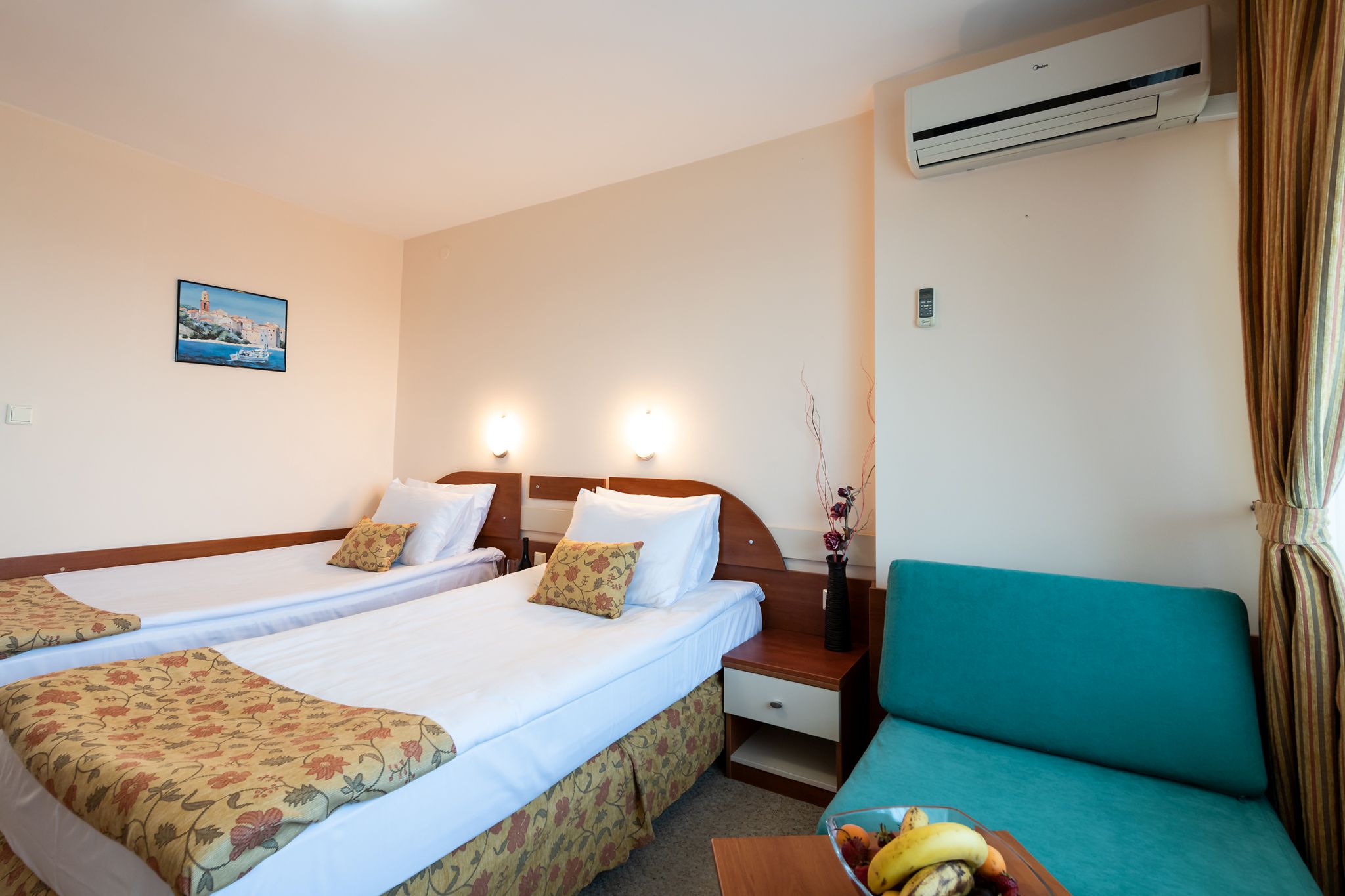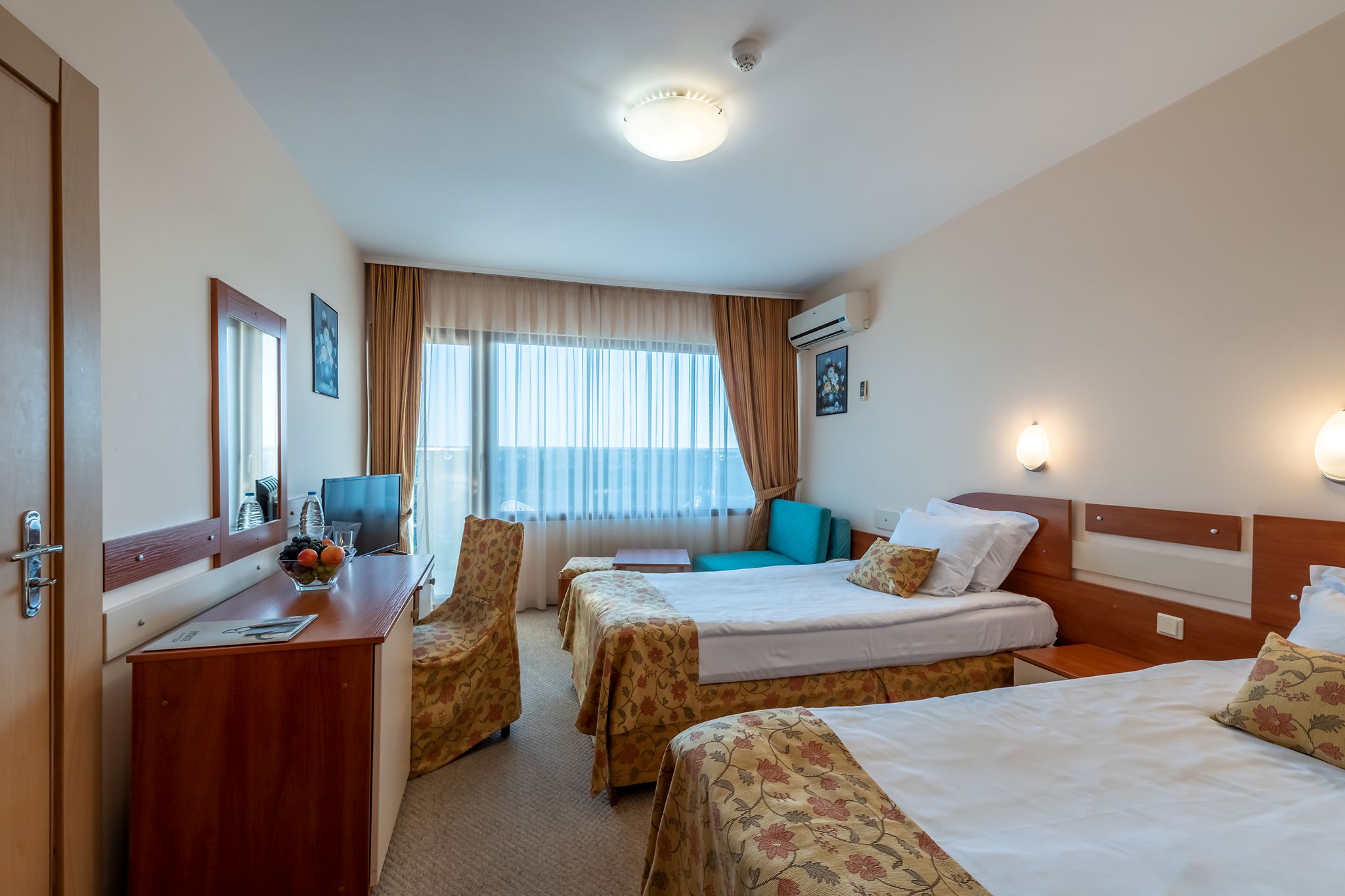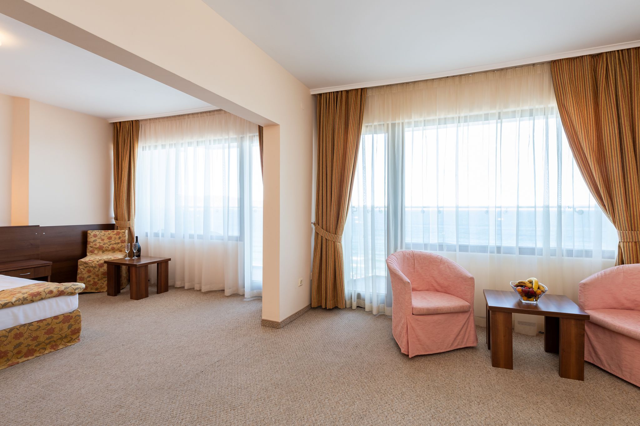 Toate camerele dispun de aer conditionat individual, tv satelit, seif, baie cu dus, uscator de par, mocheta, vedere la parc/ laterala la mare/ directa la mare.
