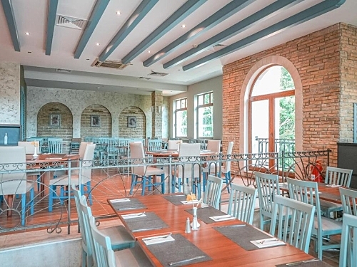 restaurant a la carte cu terasa, lobby bar, snack bar, restaurant "Rai" la plaja (situat intre hotelurile Laguna Beach si Boryana; deschis intre 15 Iunie si 15 Septembrie, ofera pranz intre orele 12:00-14:00; gustari si bauturi intre 14:00-15:00).