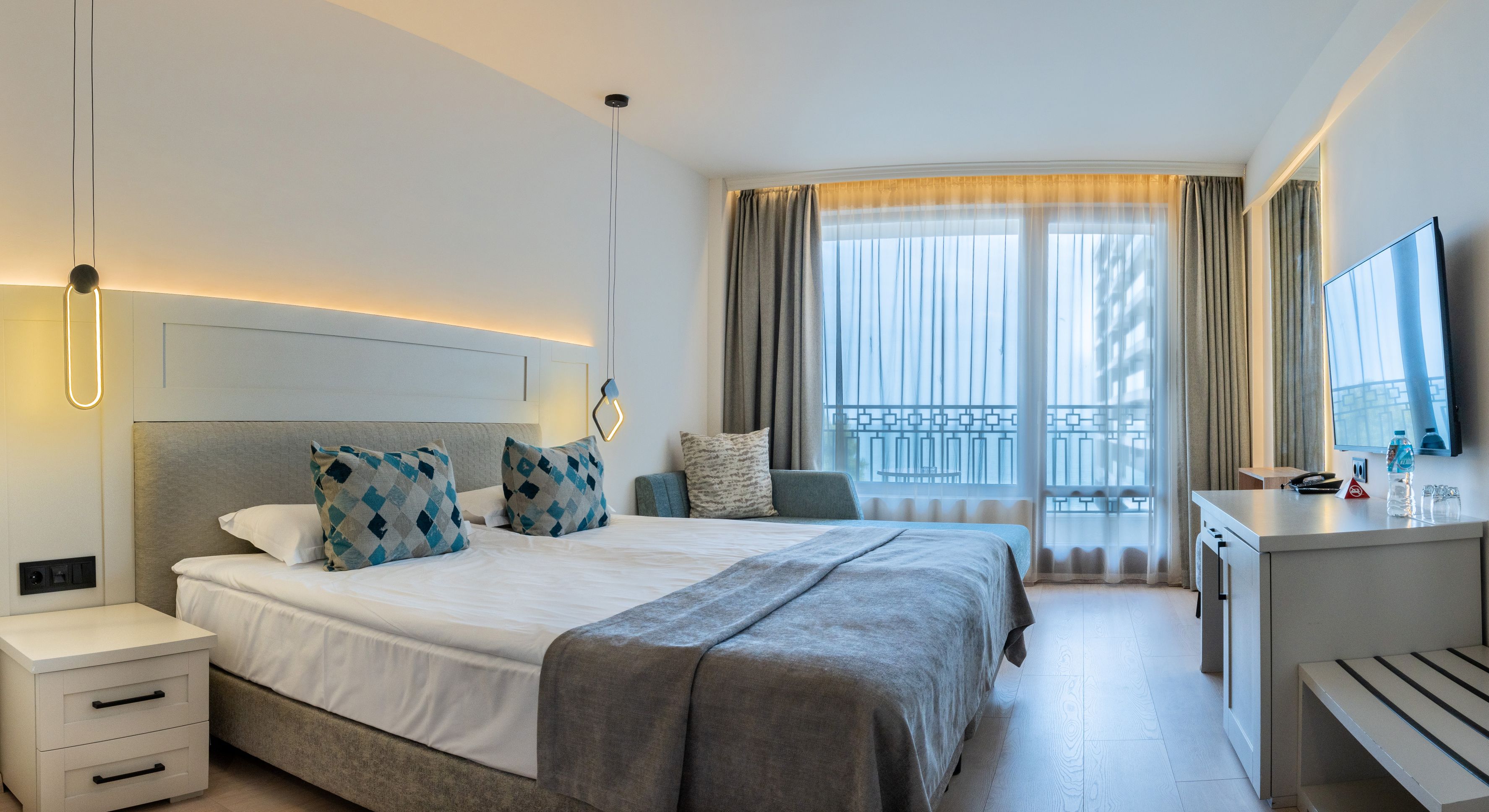 • Camera de familie deluxe cu vedere frontala la mare - 52 mp, sunt situate in cladirea noua, compuse dintr-un dormitor al copiilor cu paturi suprapuse si un dormitor cu 2 paturi twin sau 1 pat dublu matrimonial. Dormitoarele sunt despartite printr-o usa glisanta. Acest tip de camera dispune de 1 baie cu dus. In tarif este inclus si transferul de la Aeroportul International Varna.