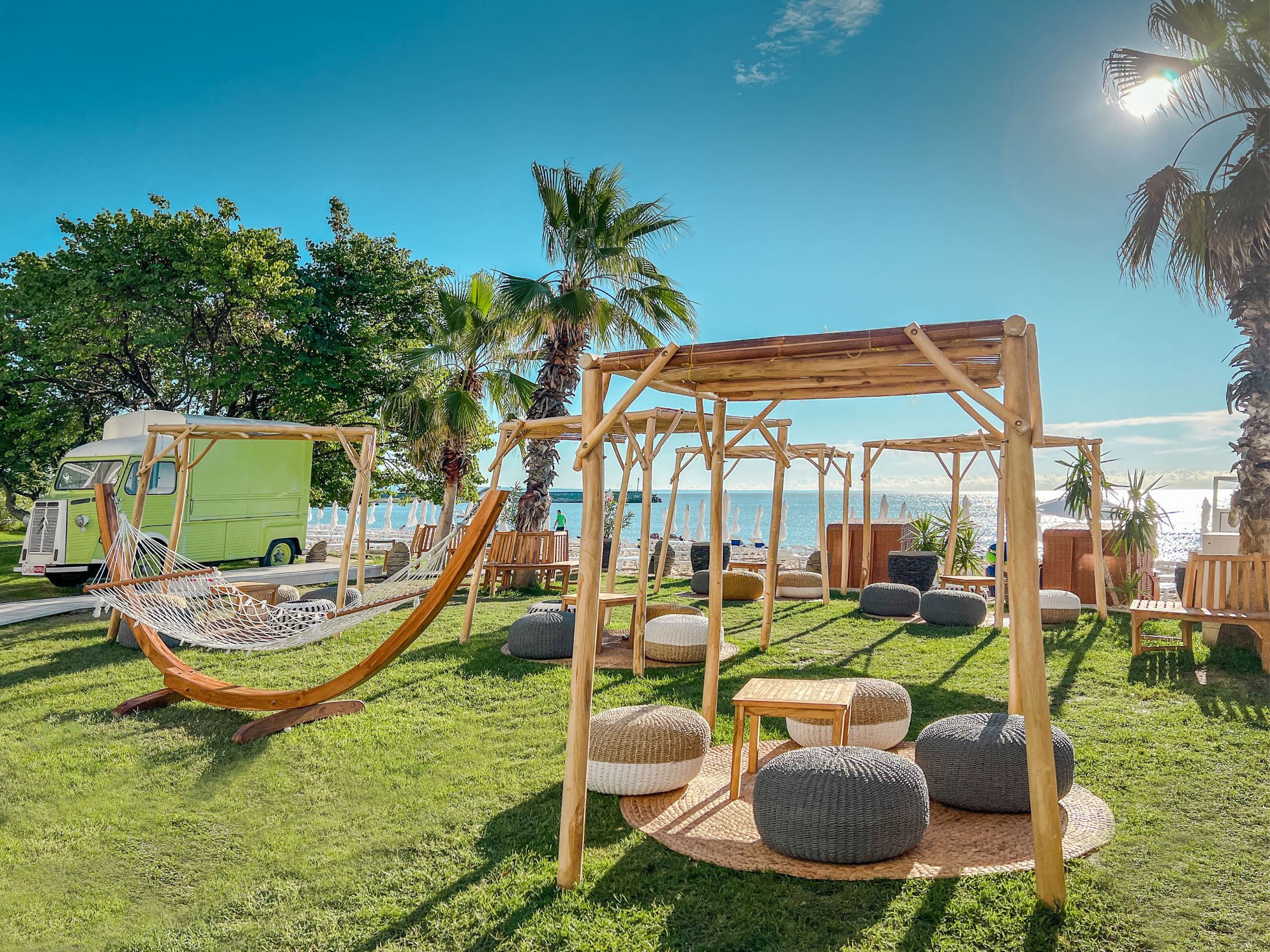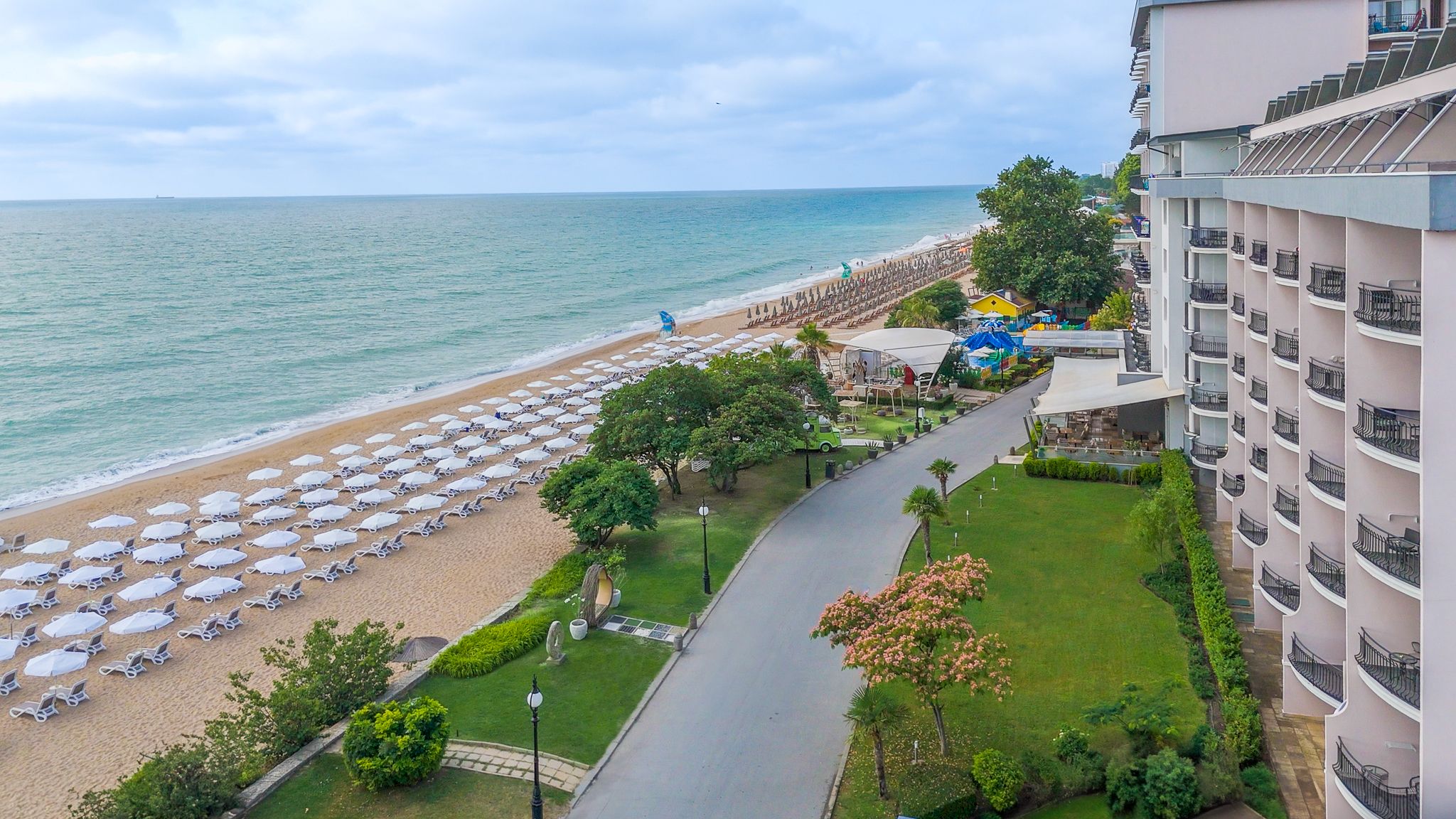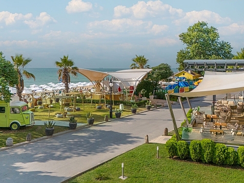 Sezlonguri (cu saltele) si umbrele pe plaja - in limita disponibilitatii si incluse in pret doar pentru persoanele ce platesc tarif intreg (primii doi adulti din camere duble si family, si un adult in camera single). Terasa cu gustari la pachet chiar langa promenada (hot dogs, sandwich-uri, salate, produse de patiserie home made, cabina cu inghetata, beach bar cu bauturi racoritoare).