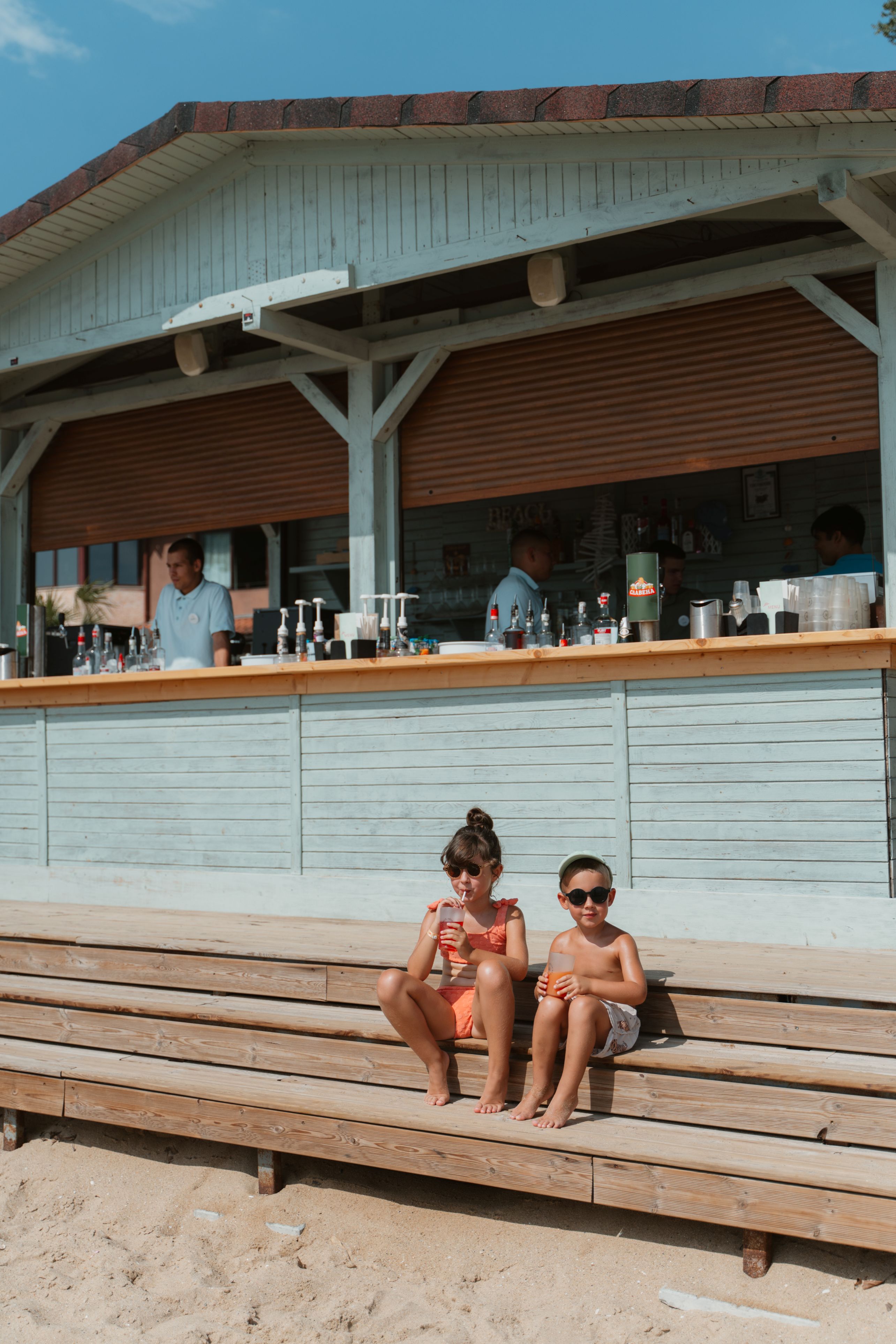 sezlonguri (cu saltele) si umbrele pe plaja - in limita disponibilitatii si incluse in pret doar pentru persoanele ce platesc tarif intreg (primii doi adulti din camere duble si apartamente, si un adult in camera single), bar la plaja - ofera doar bauturi locale, cocktailuri racoritoare, cafea, ceai si bere.