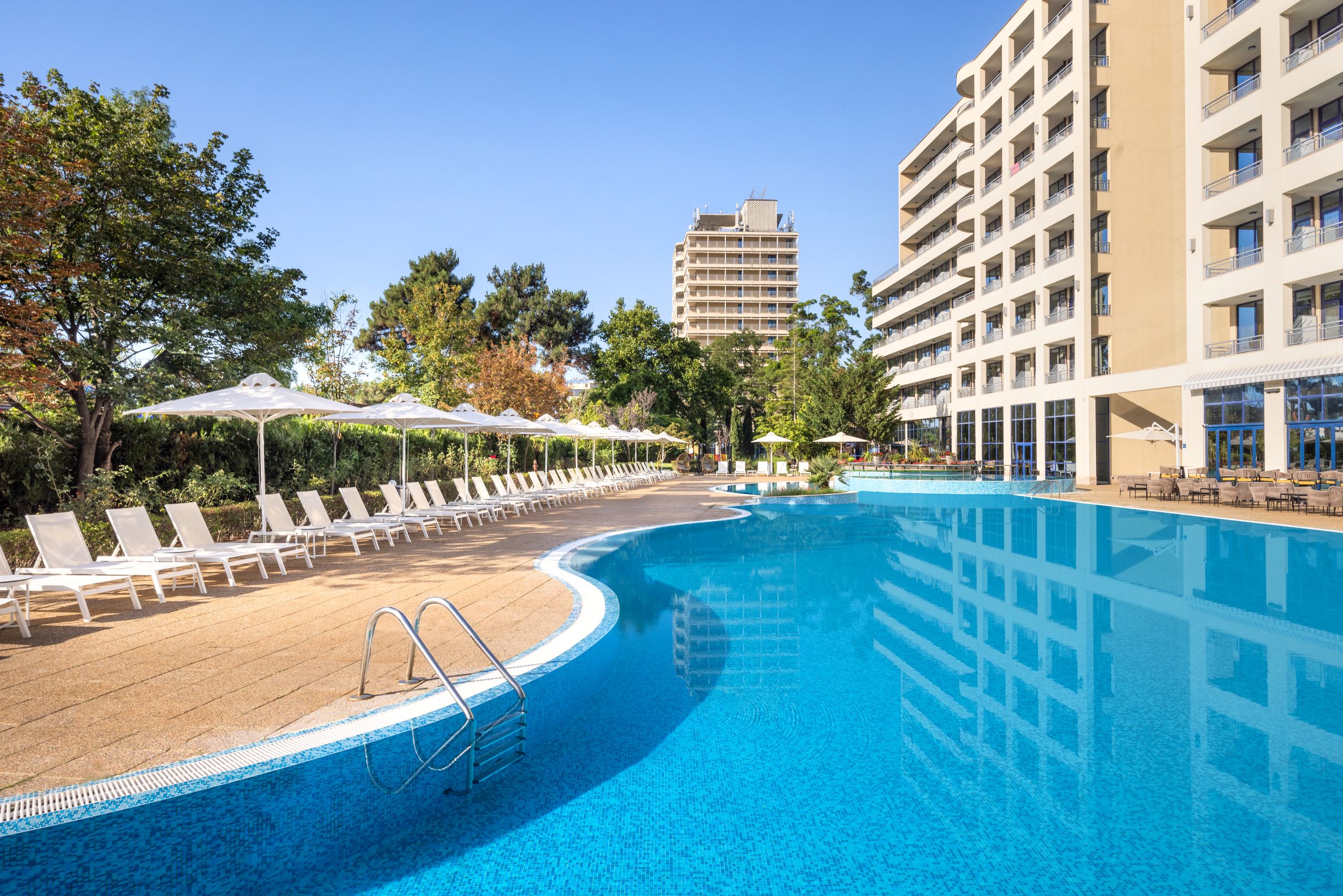 Am fost ușor dezamăgită de interacțiunea cu recepția, însă după ce solicitările noastre au fost rezolvate, totul a decurs foarte bine. Camerele sunt mari, frumoase și curate, mâncarea diversificată și gustoasă, vinul bun, iar curățenia exemplară – totul fix pe plajă, cu piscină inclusă. Nu aș recomanda hotelul familiilor cu copii mici sau persoanelor iubitoare de liniște, din cauza zgomotului care vine din stațiune. Totuși, cu geamurile închise, ai șanse mari să te bucuri de un sejur de vis. Doamnele de la curățenie sunt extrem de meticuloase și zâmbitoare. La masă, mesele erau dezinfectate după fiecare utilizare, personalul atent și rapid în debarasare. Noi am fost la început de septembrie, când nu erau foarte mulți clienți, iar experiența a fost cu adevărat plăcută. All Inclusive Light = 4–6 feluri de mâncare gătită, din care puteai alege, plus baze pentru salate, pește, supă etc. Este departe de conceptul de all inclusive pe care-l știm, însă nimeni nu rămâne nemâncat. Prăjiturile sunt geniale. Mi-a plăcut că vinul se servea din sticlă și că programul de servire a mesei era generos.