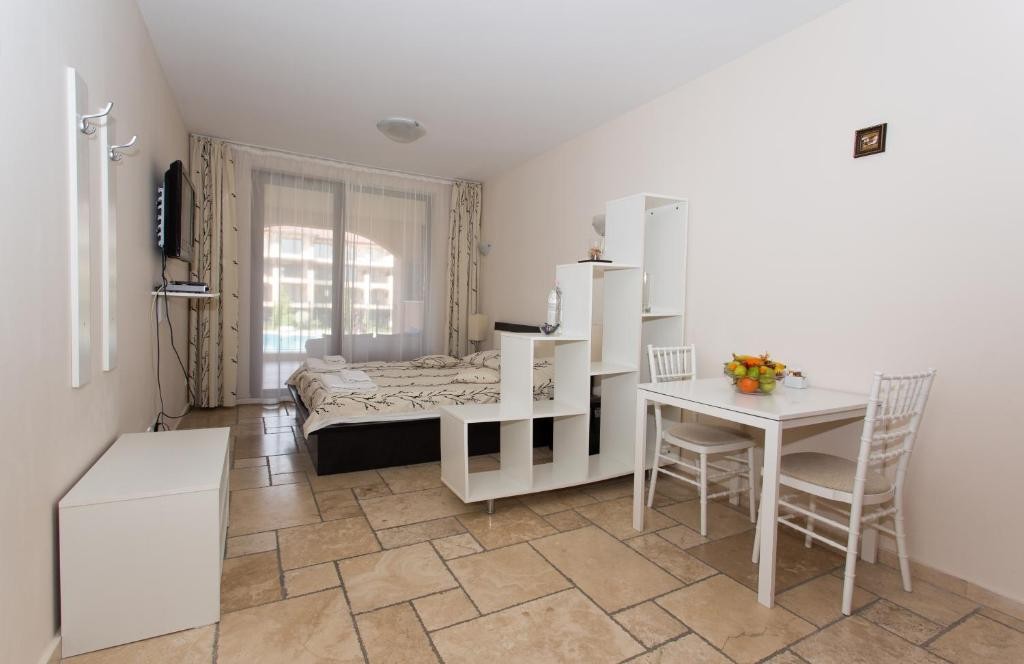 • Apartament cu 1 dormitor ( 65 mp) vedere la piscina, dormitor cu pat dublu, living cu canapea extensibila, chicineta si balcon mobilat.