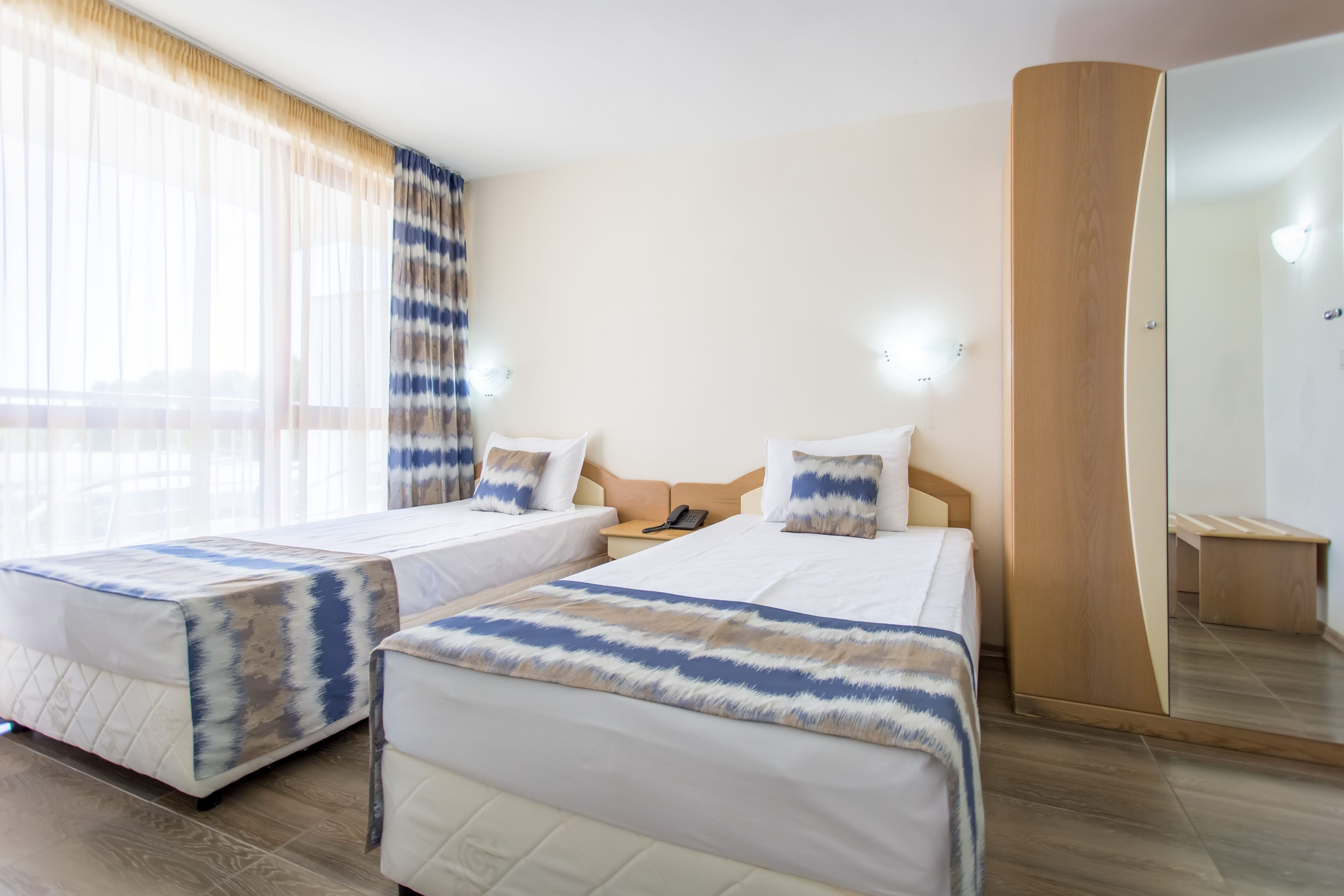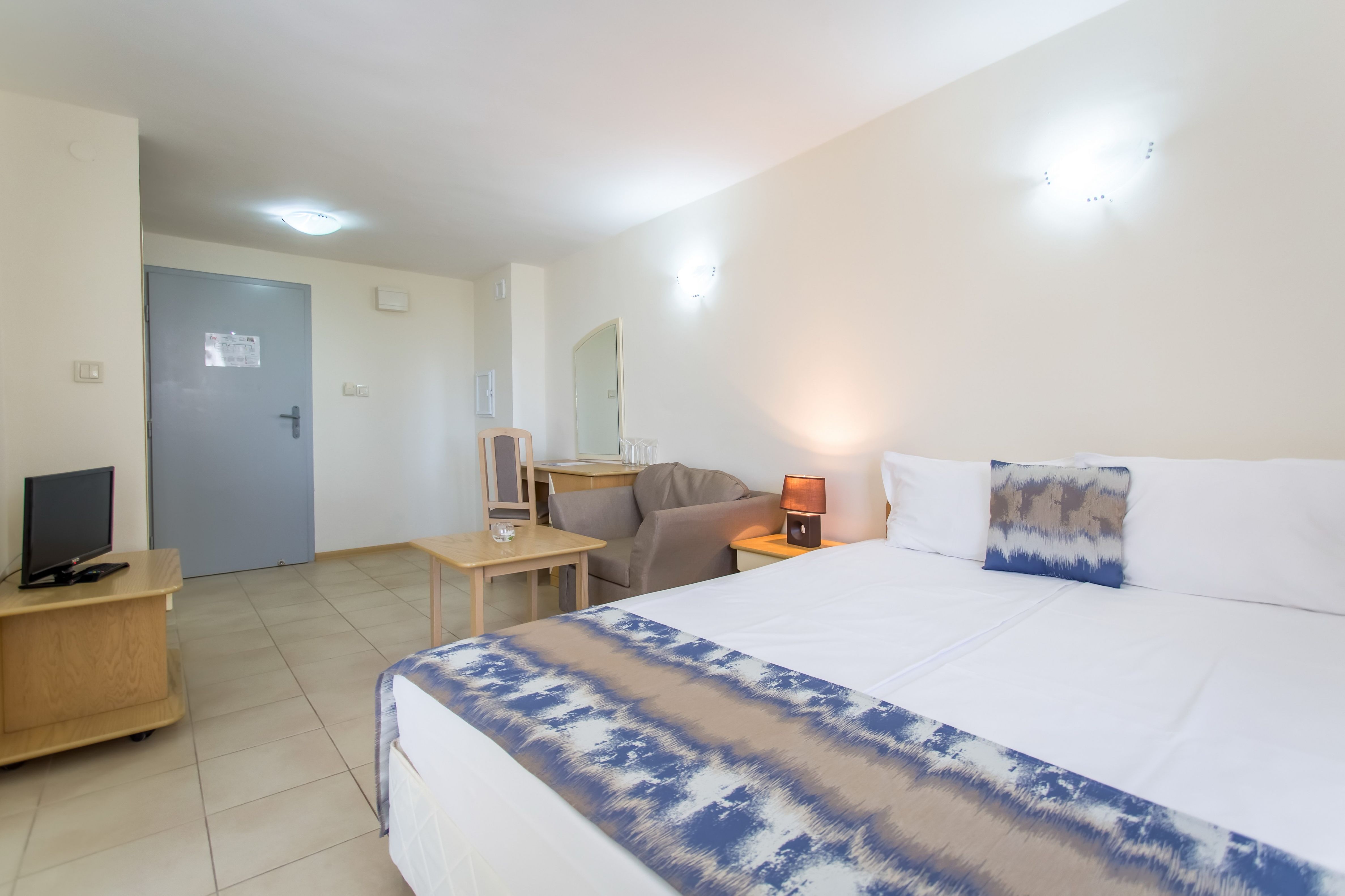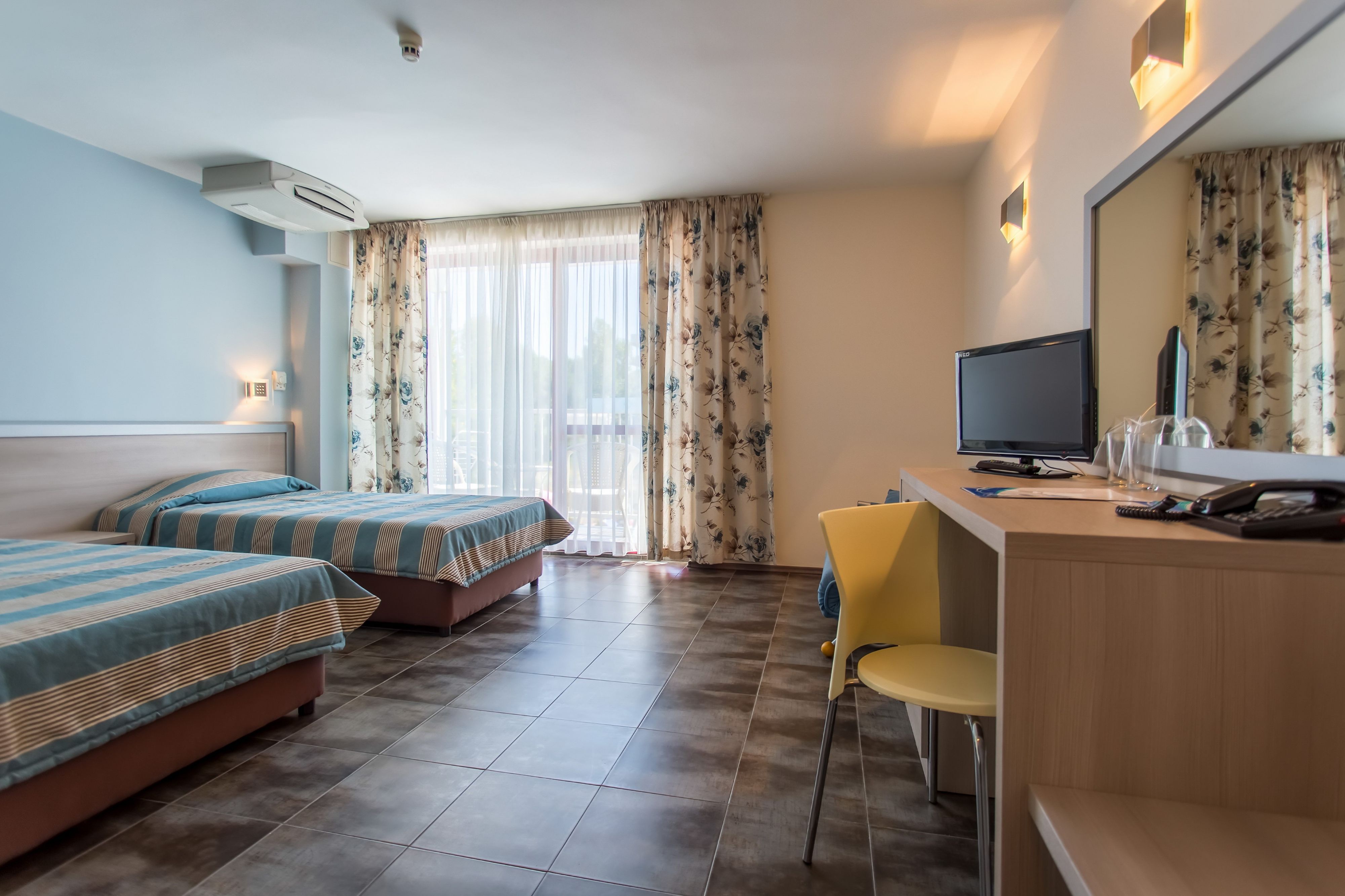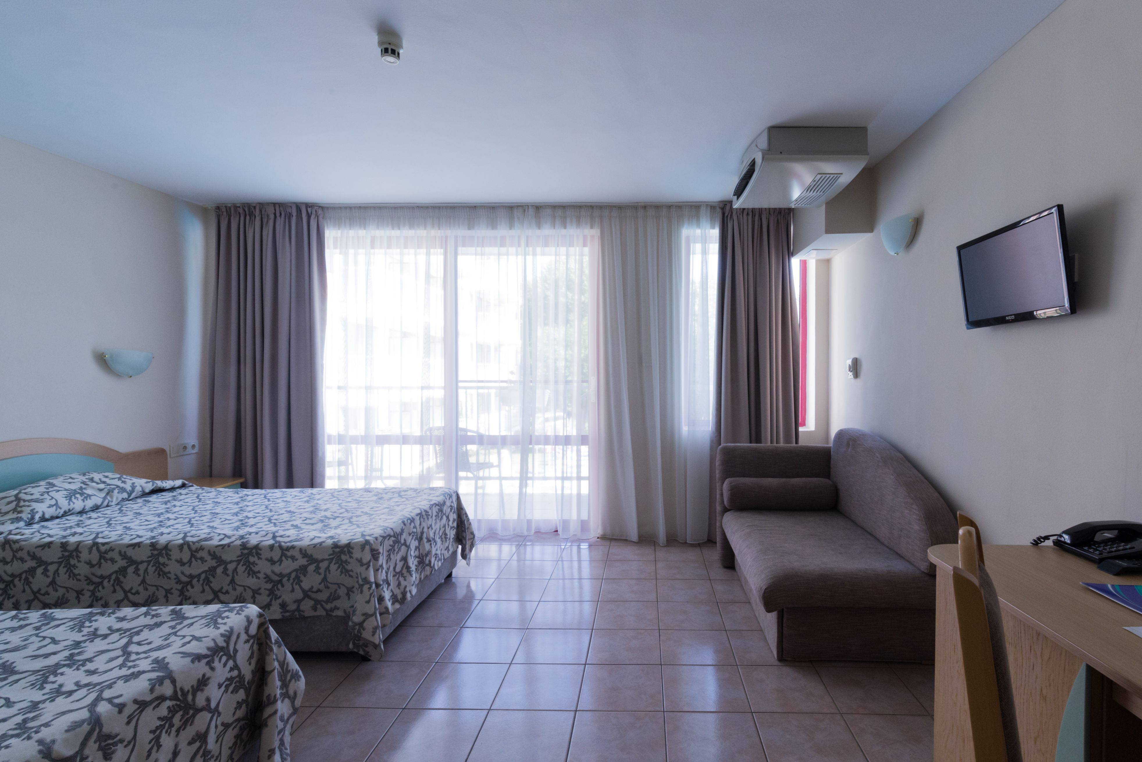 Toate camerele dispun de aer conditional centralizat, mini frigider, telefon, tv prin satelit, Wi-Fi, balcon cu masa si scaune, plasa de tantari, baie cu dus, uscator de par.