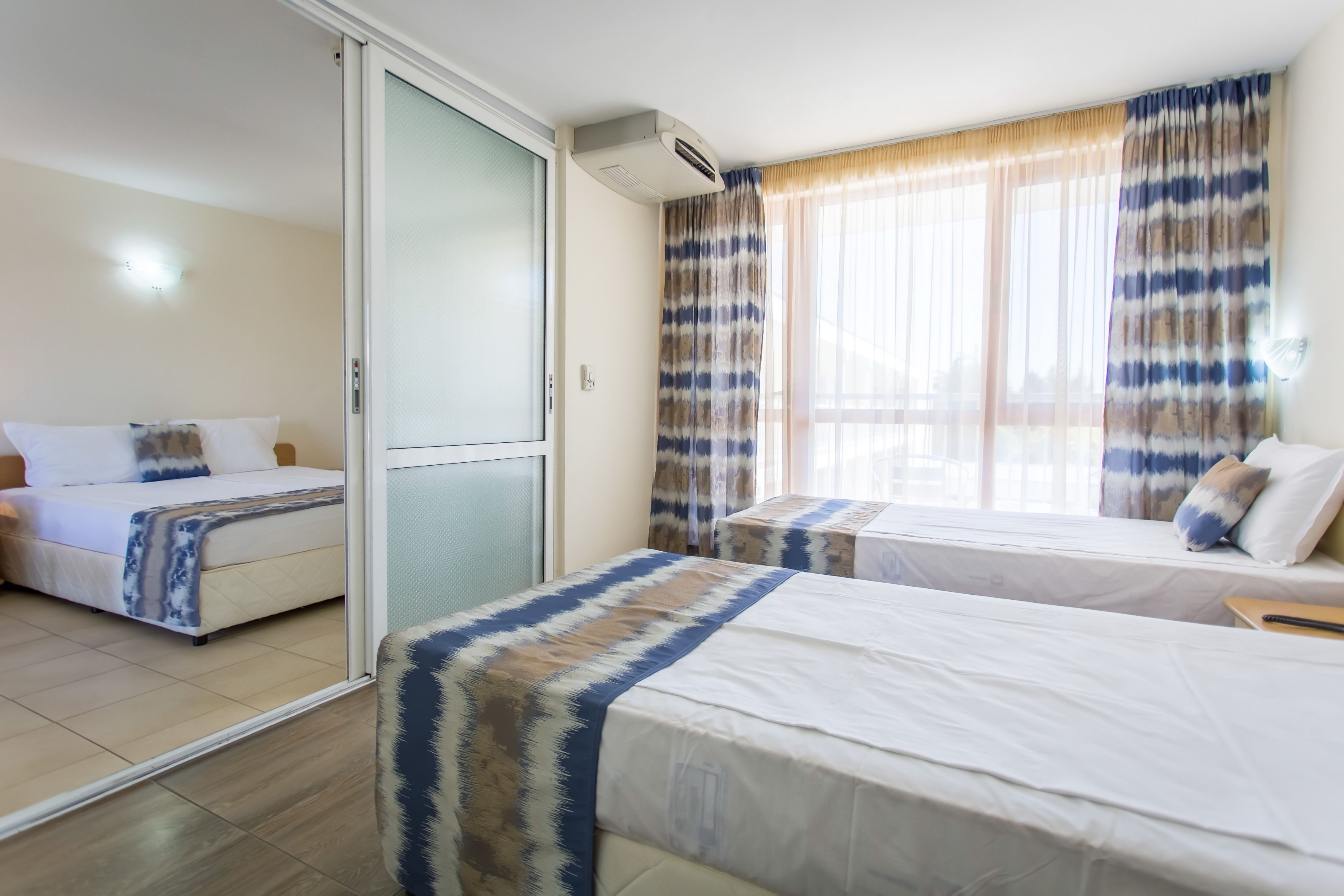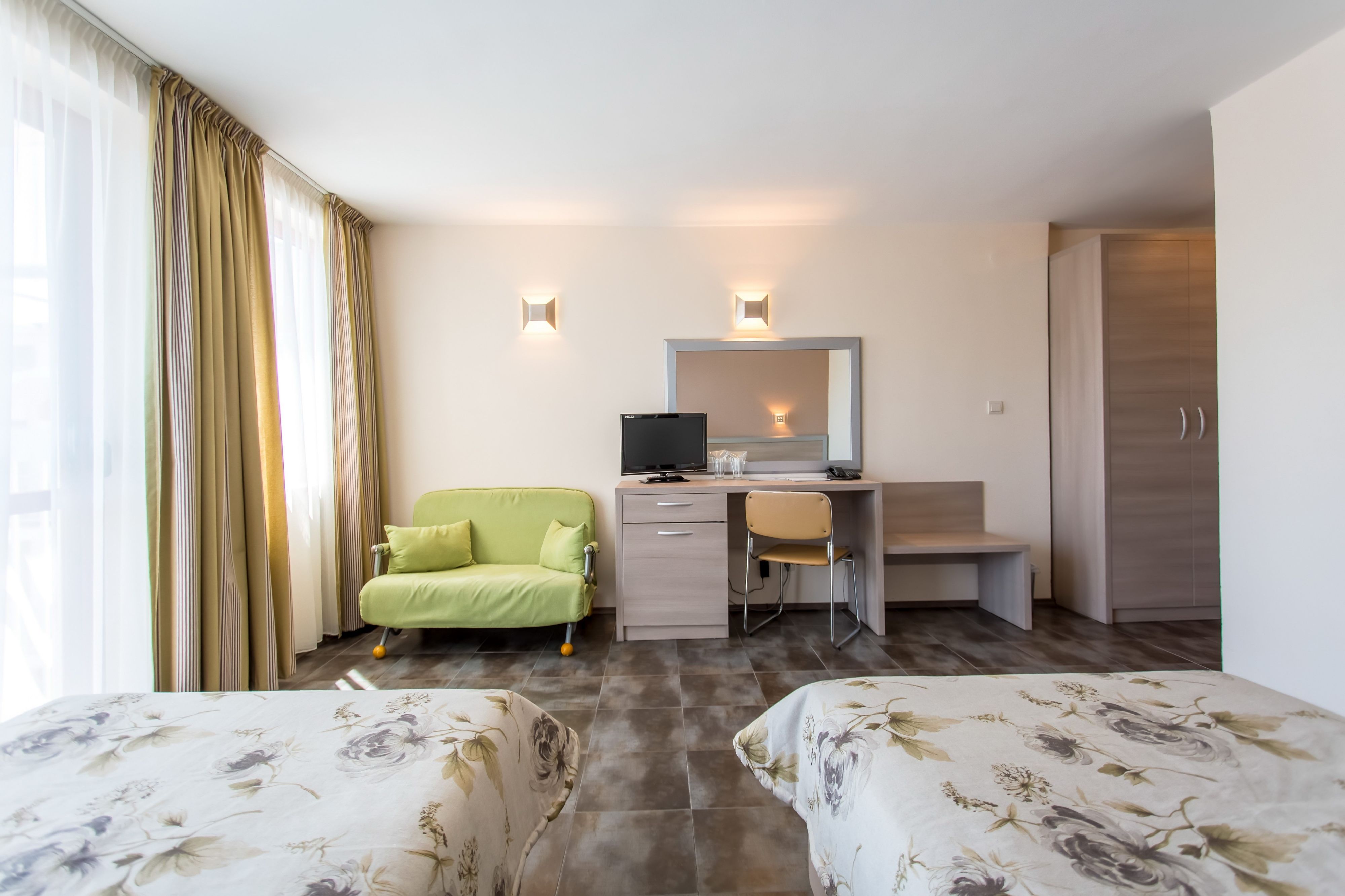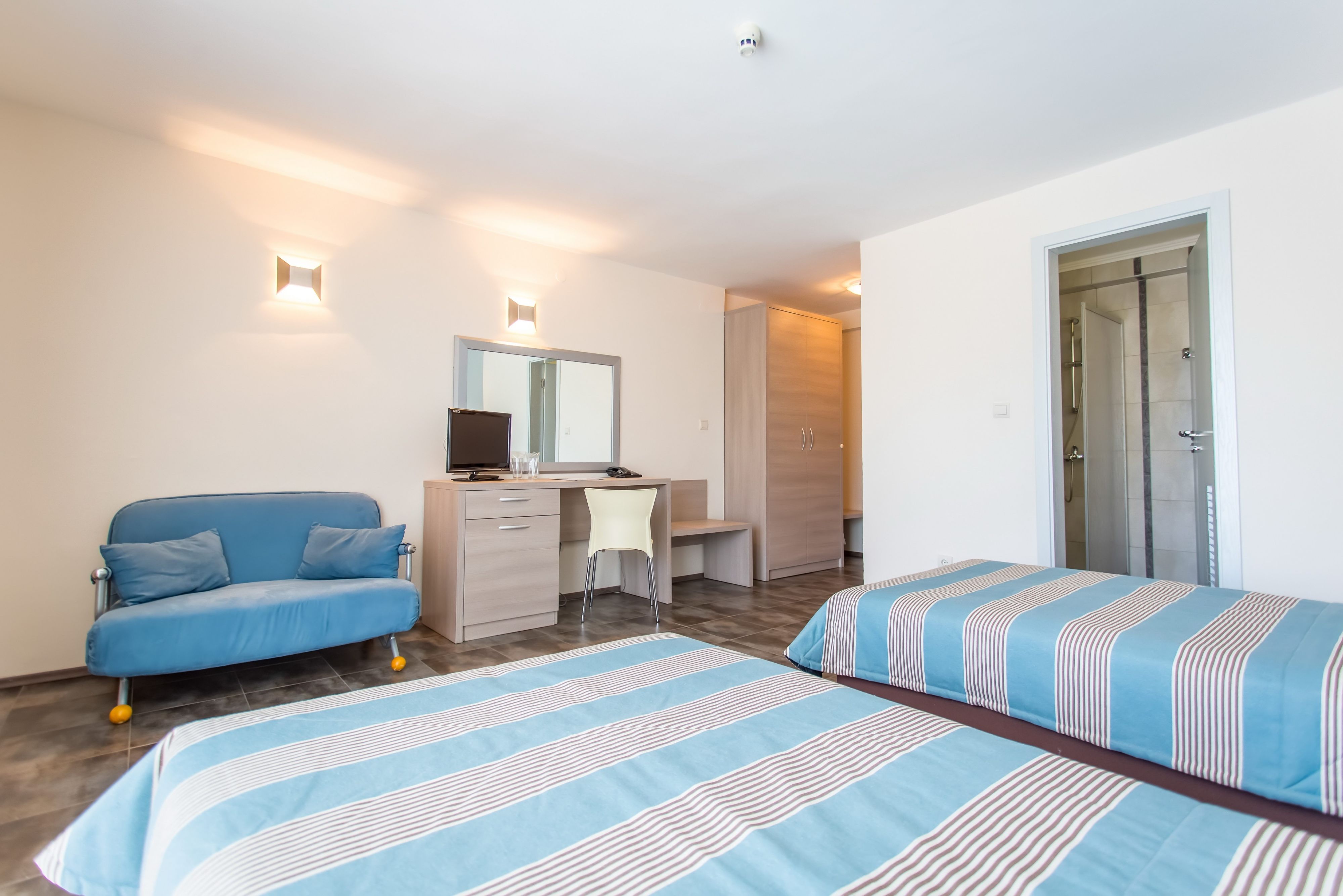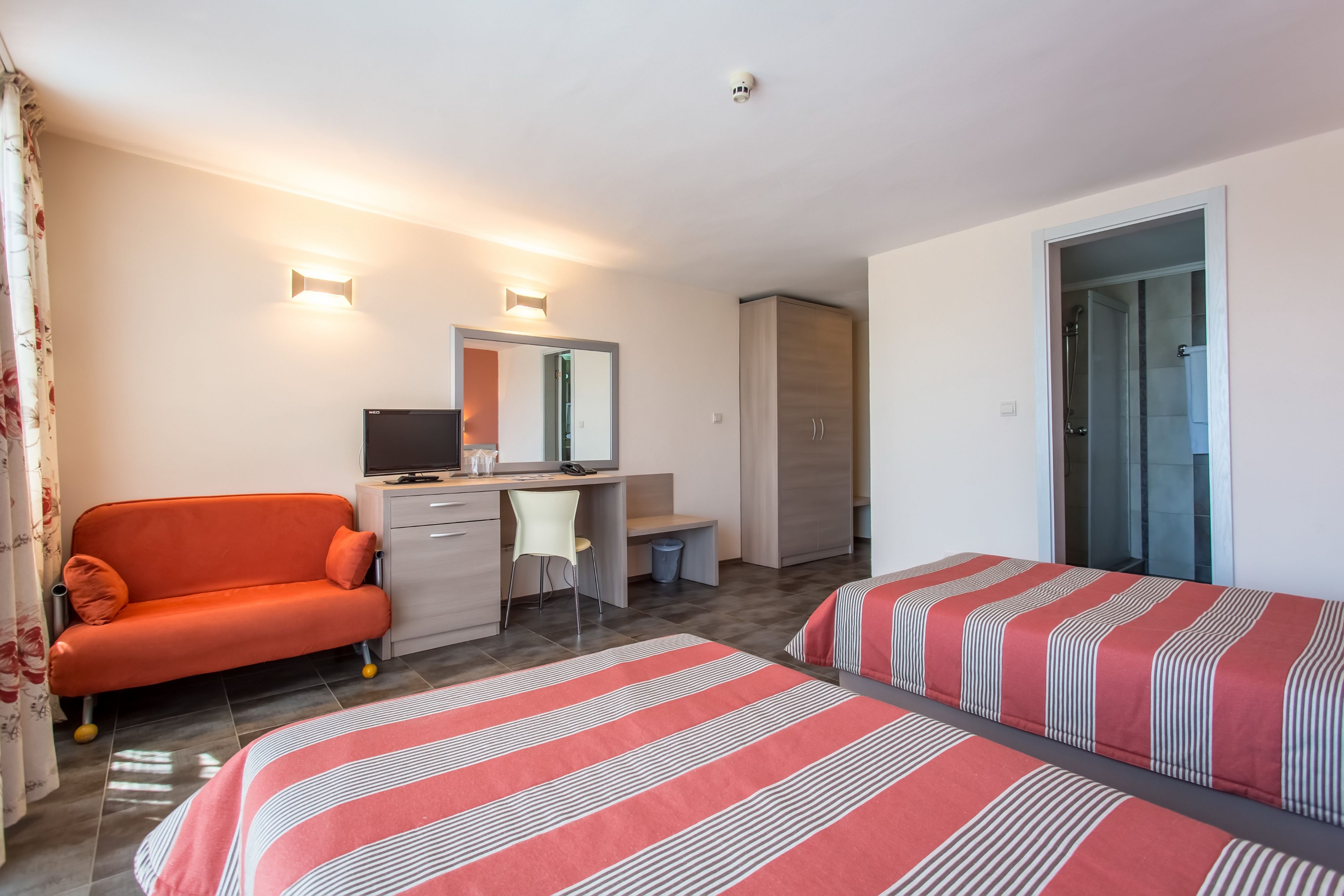 • Camera de familie - alcatuita din 2 camere alaturate conectate printr-o usa, doua paturi single si 1 pat dublu, fotoliu.