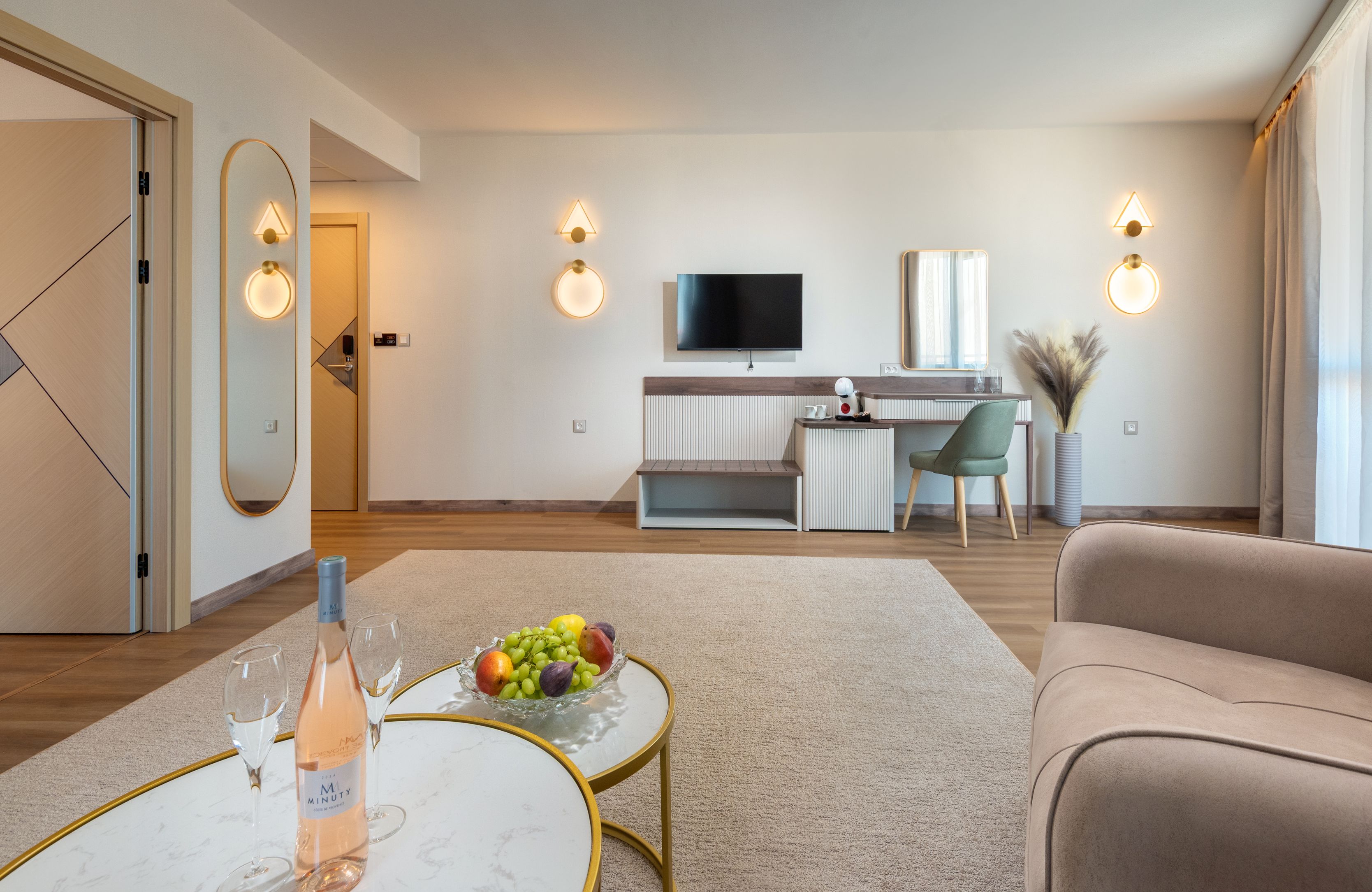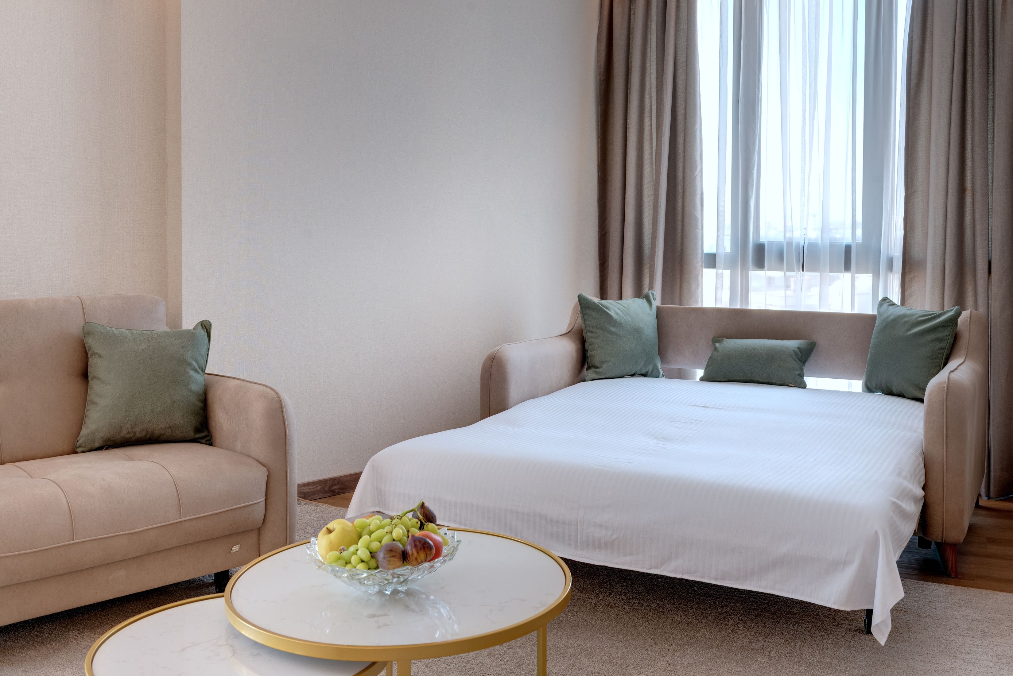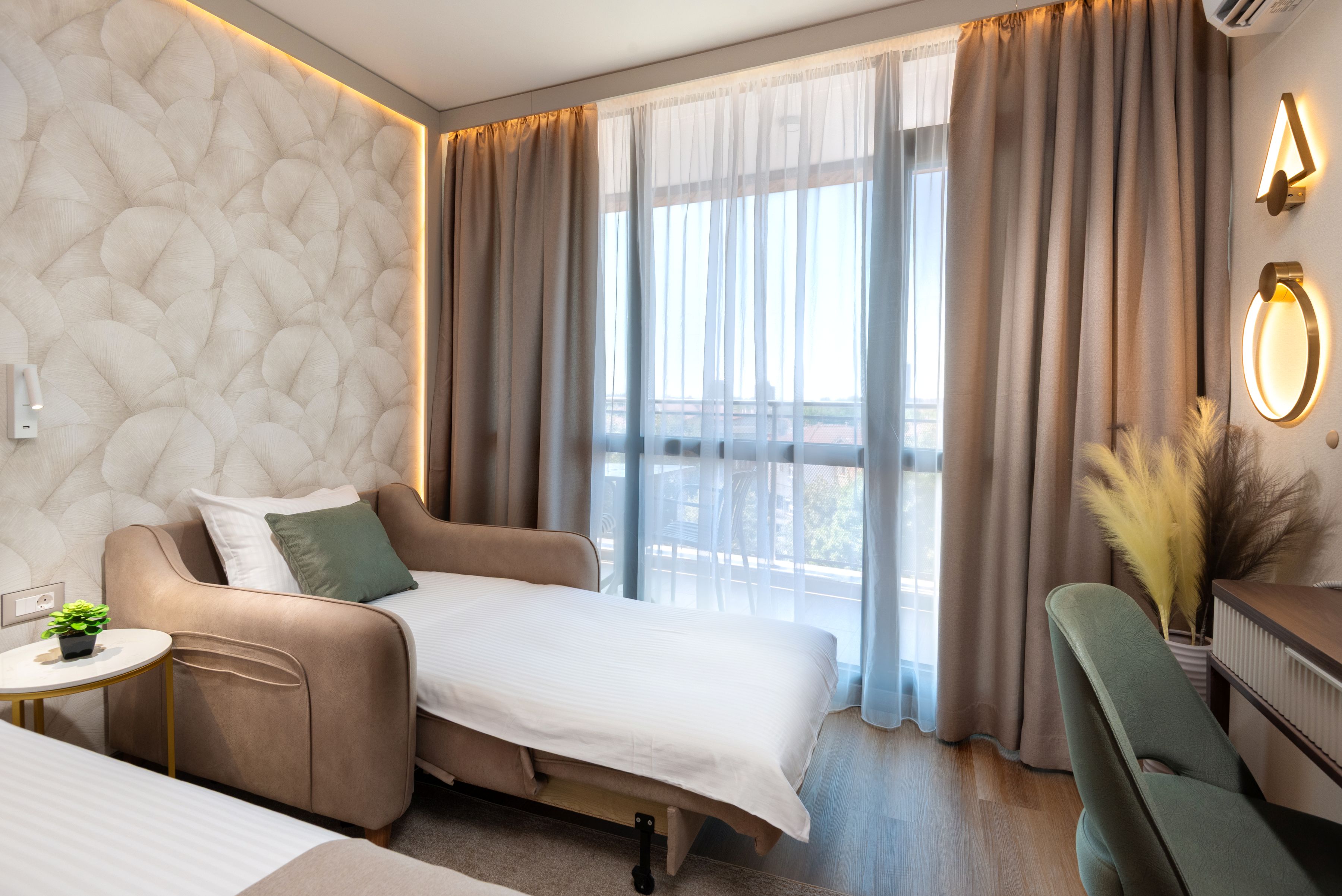 • Apartament cu 1 dormitor (aprox. 36 mp) - dormitor si living despartite de usa; pat dublu sau doua paturi single unite in dormitor si o canapea extensibila sau doua fotolii extensibile in living.