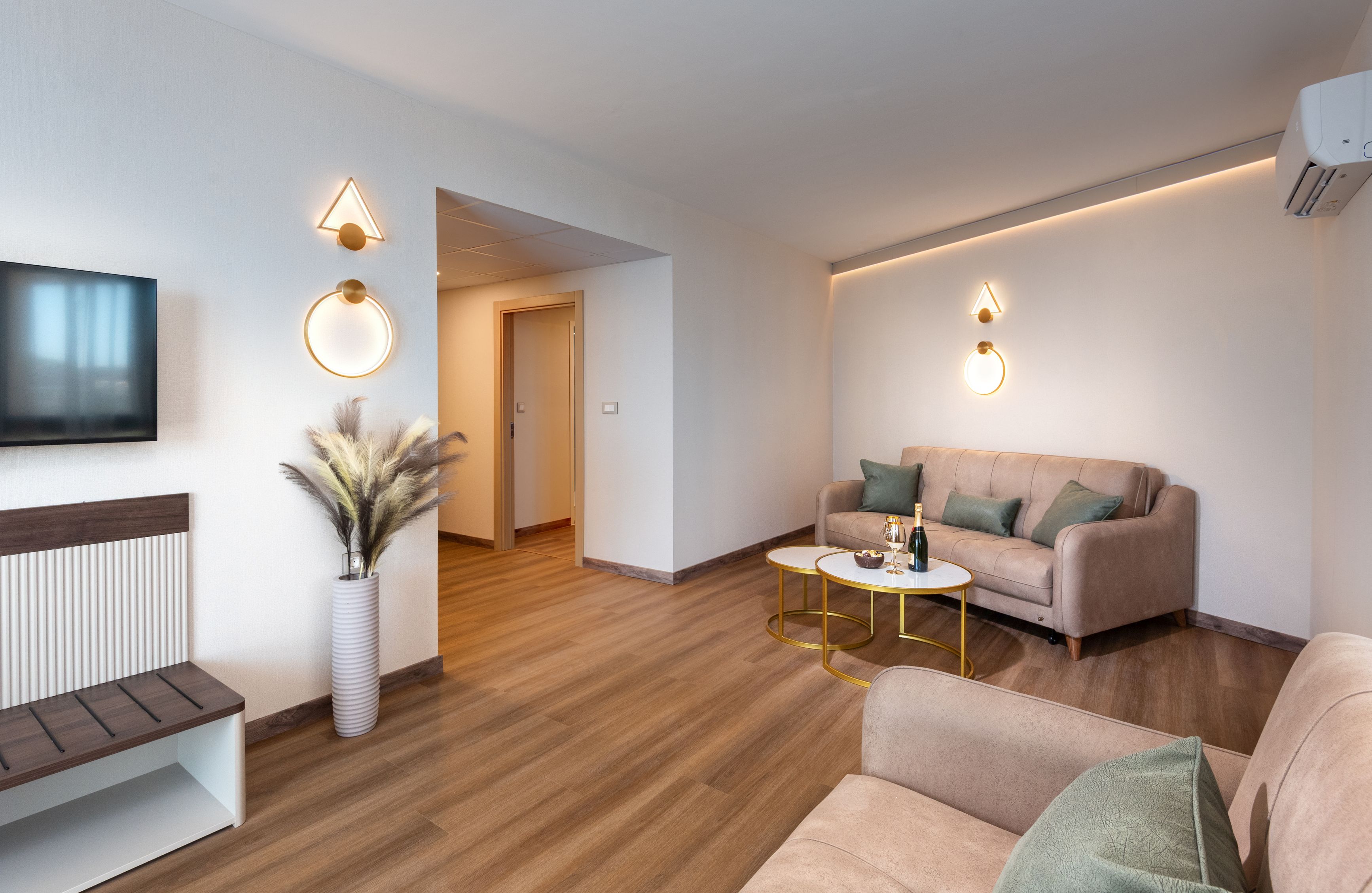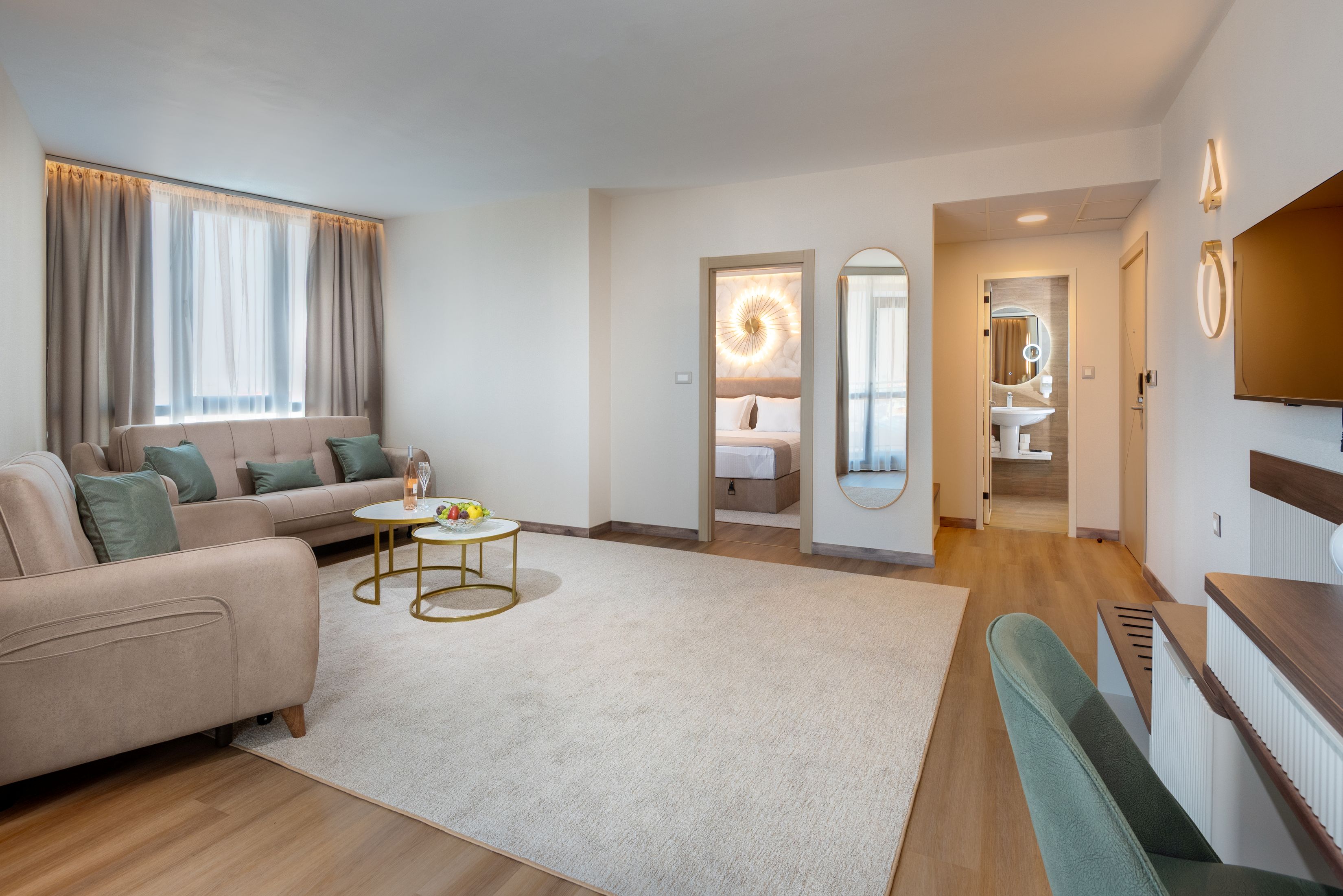 • Apartament cu 2 dormitoare (aprox. 50 mp) - doua dormitoare separate prin usa, living; pat dublu sau doua paturi single unite in dormitoare si o canapea extensibila in living.