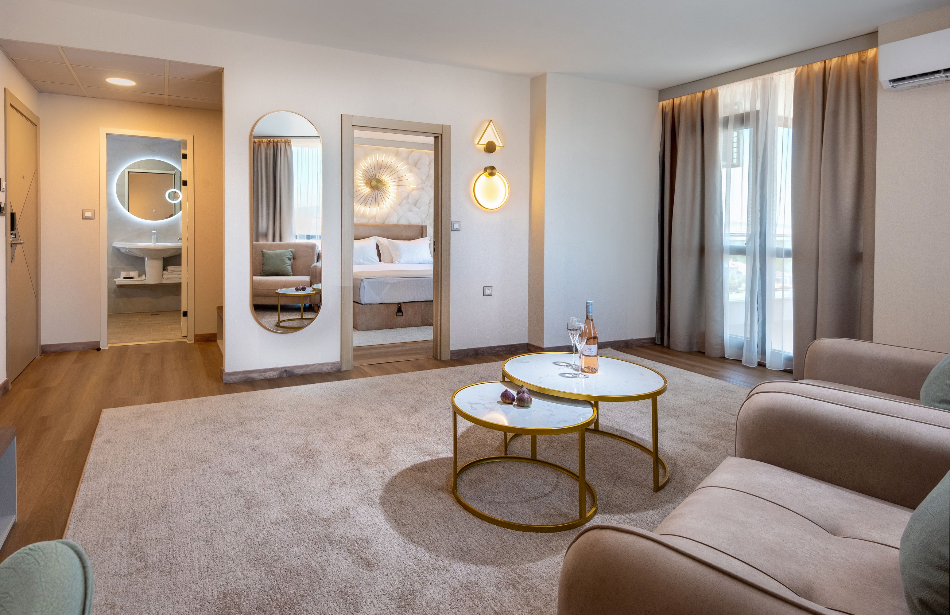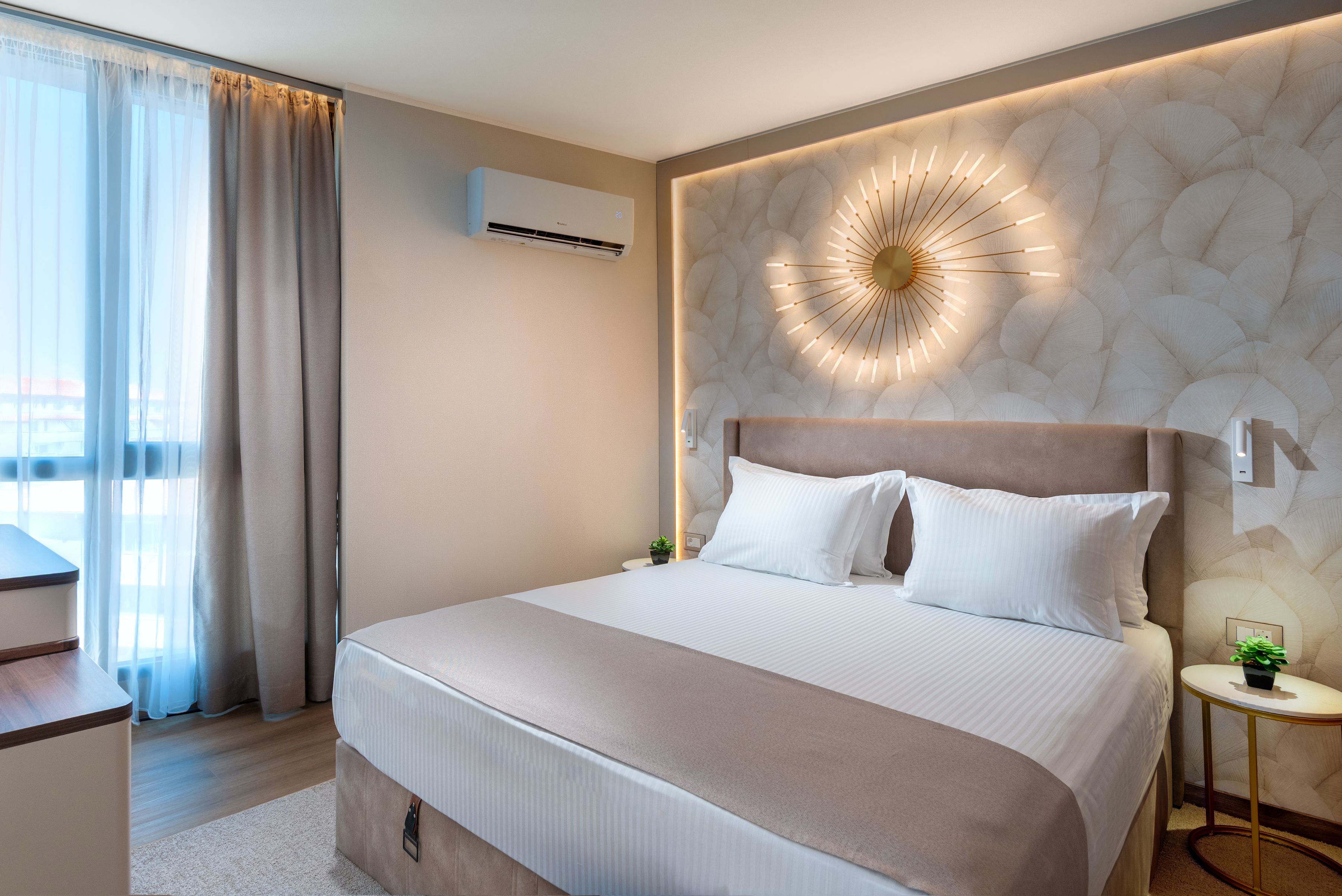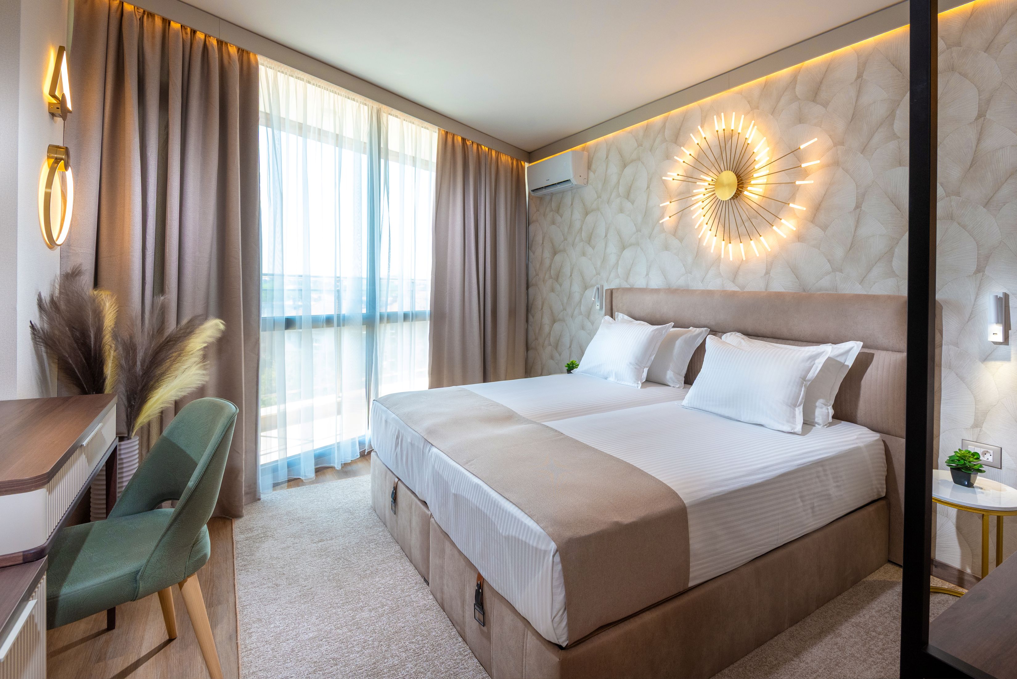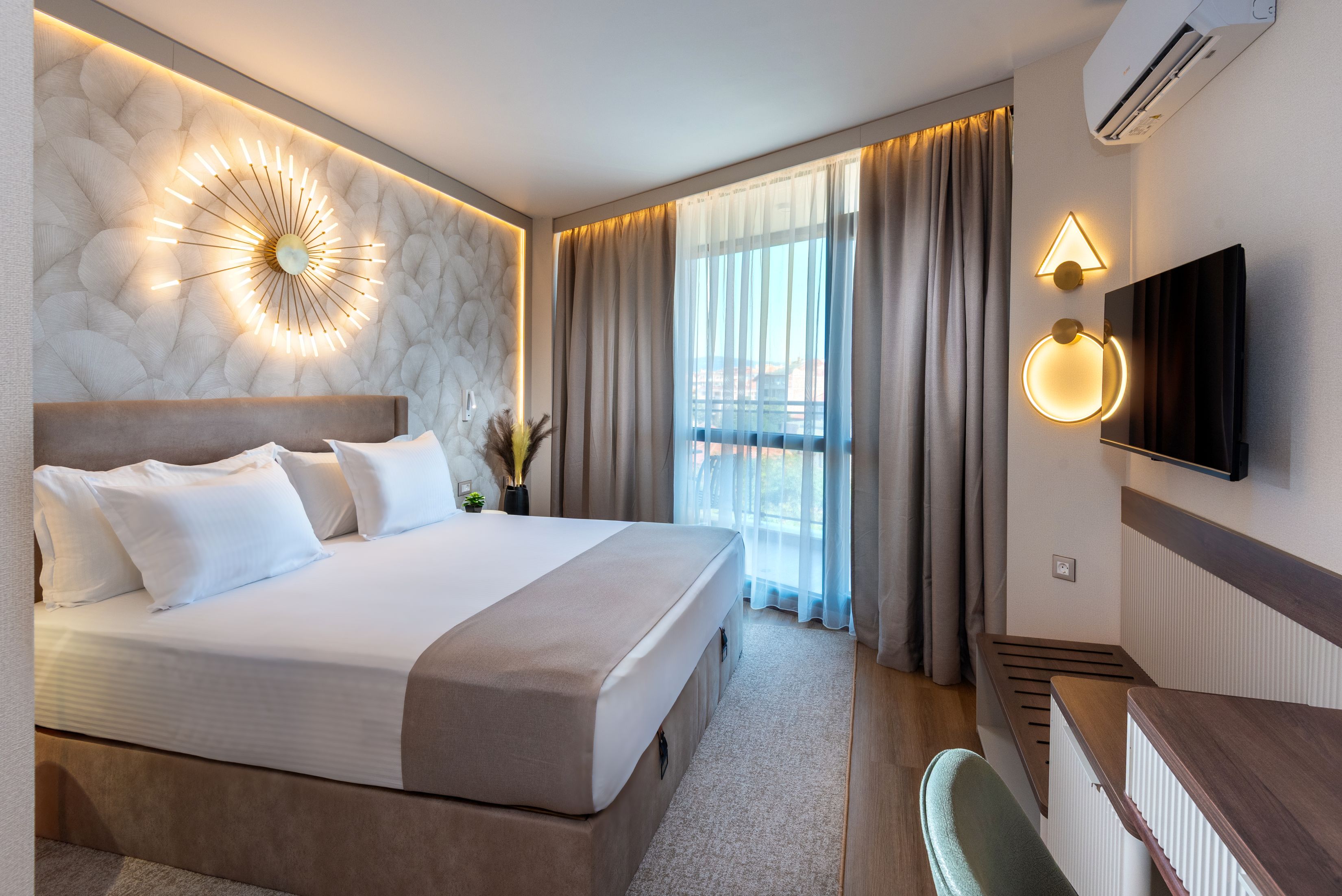 Hotelul ofera cazare in 94 de unitati (camere si apartamente) mobilate modern si dotate cu aer conditionat, telefon, TV satelit, acces internet, mini bar, aparat cafea, seif si balcon.