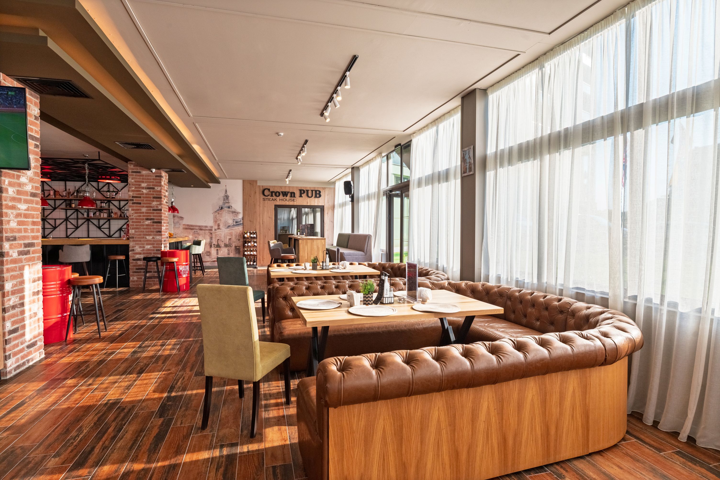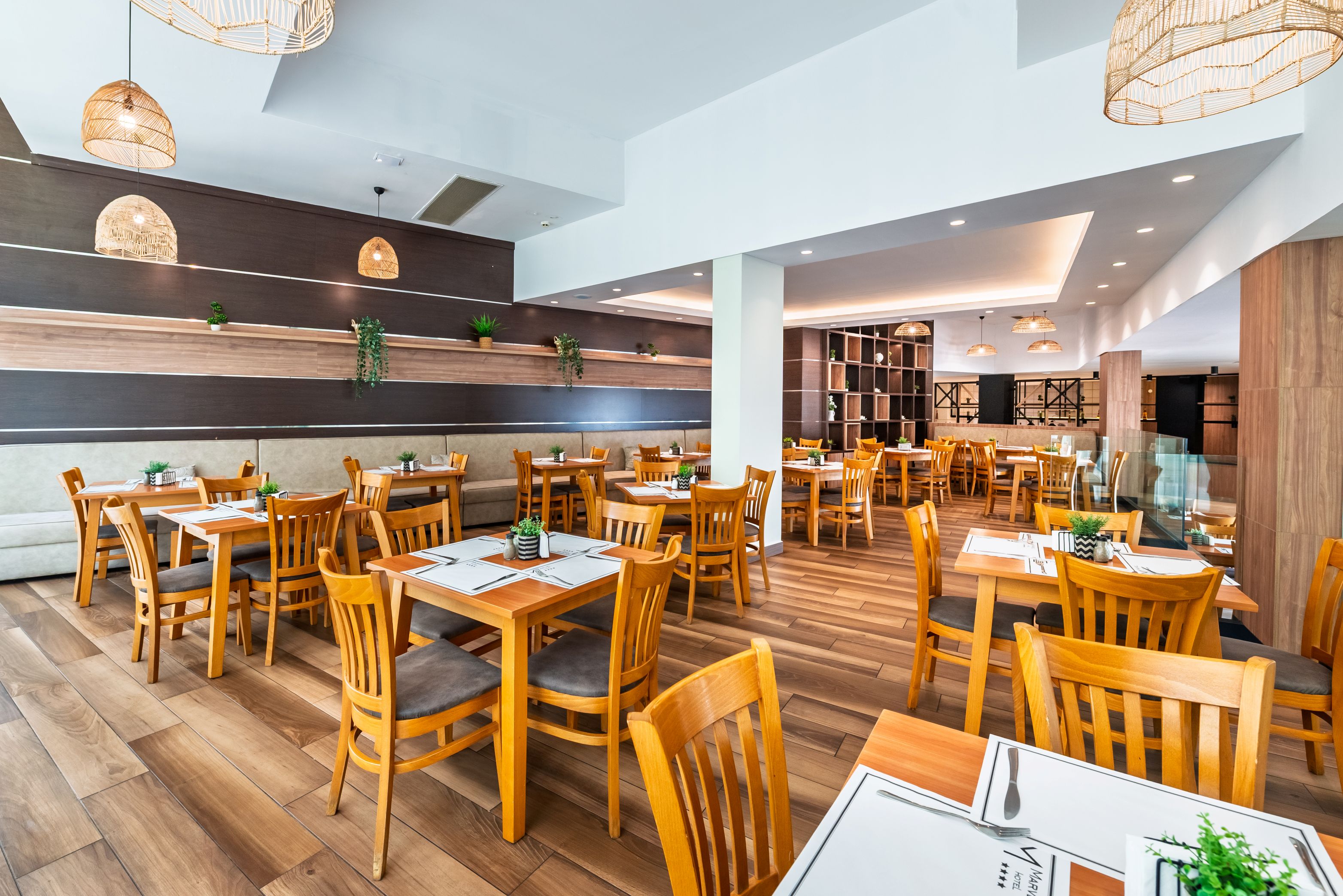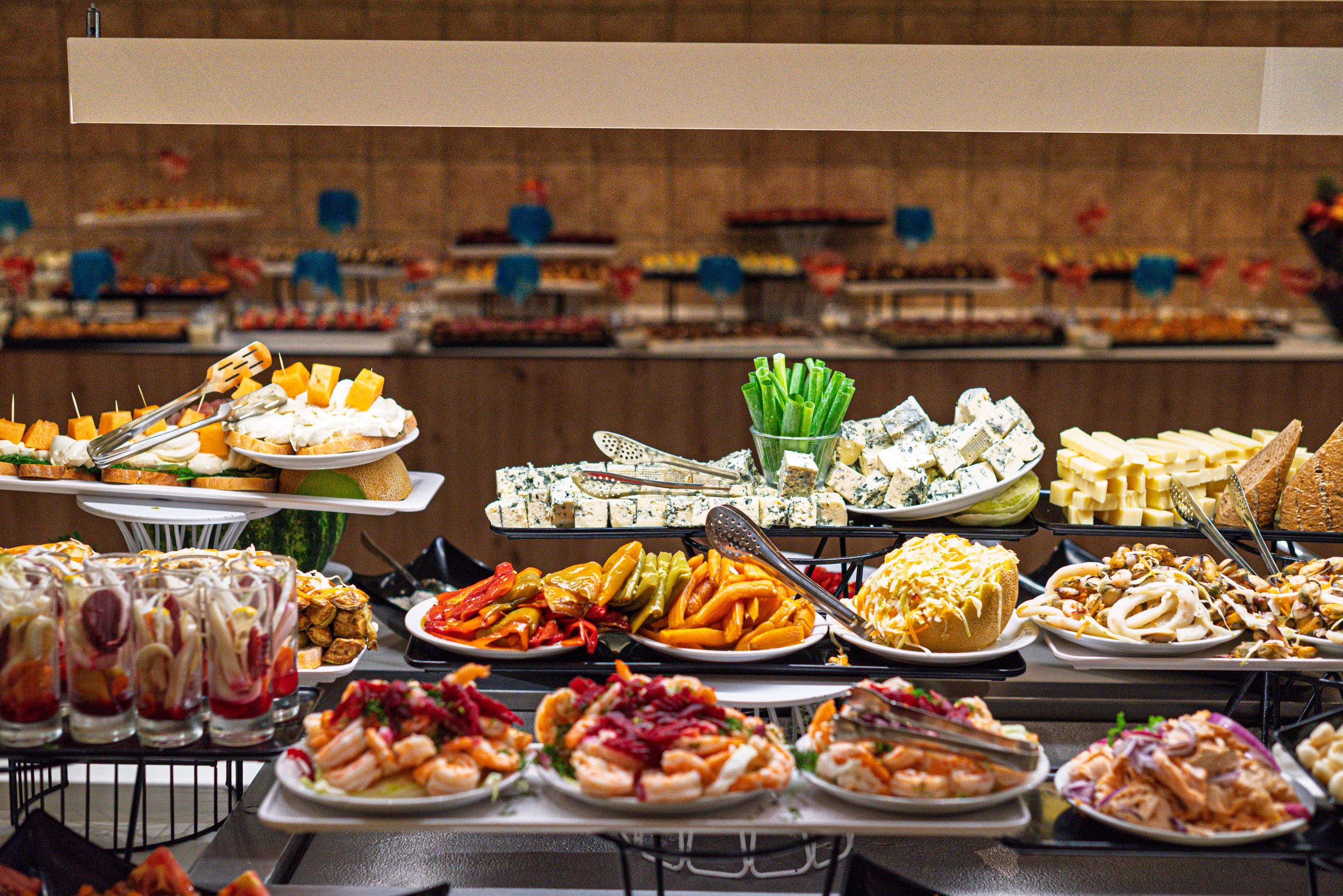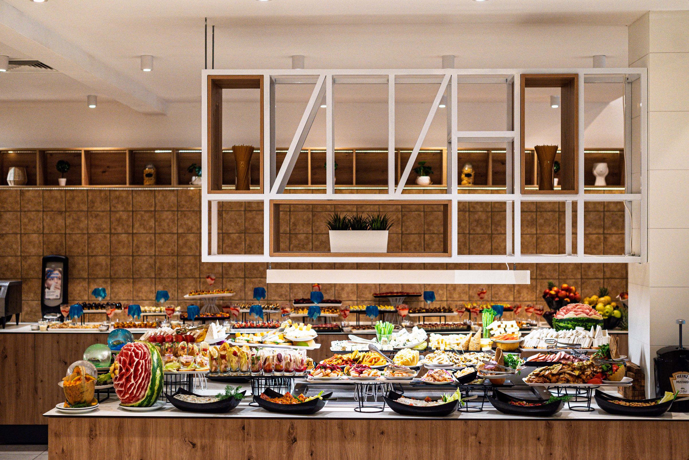 3 restaurante: 2 restaurante all inclusive (Bendida si Ambrosia) si un restaurant à la carte Crown Pub by Madri (Steak House - NOU), lobby bar, bar la piscina si bar Marvel (all inclusive), meniu vegetarian pentru prânz și cină (paste, tocană de legume, risotto, cartofi prăjiți și fructe de mare).