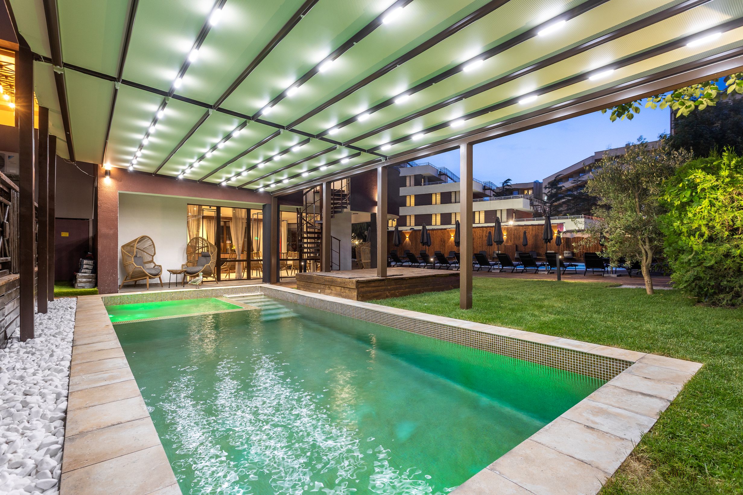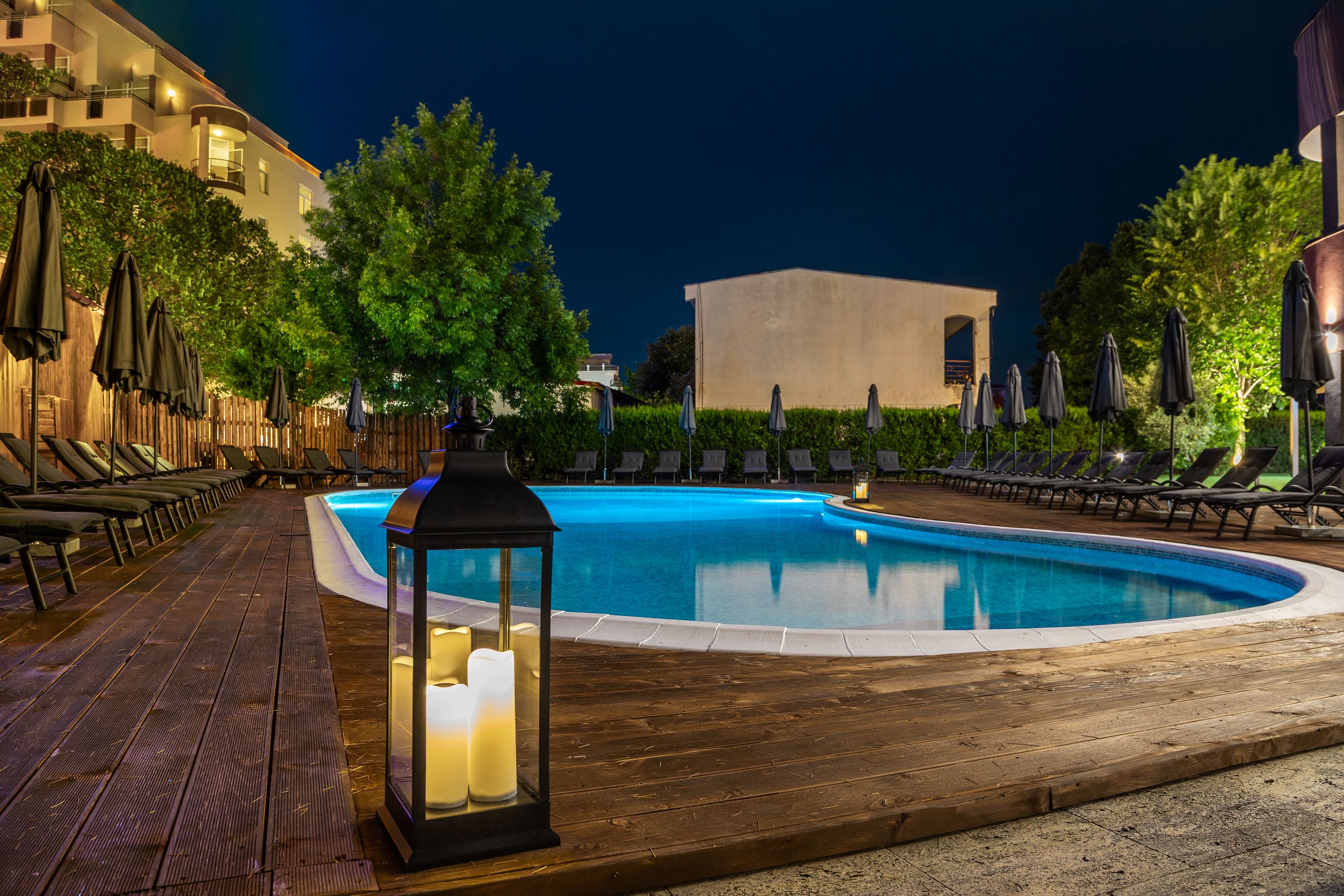 piscina exterioara, sezlonguri si umbrele la piscina (in limita disponibilitatii), piscina interioara, receptie 24 h, serviciu majordom, instructor de sport, WI-Fi in camere si in zonele comune.