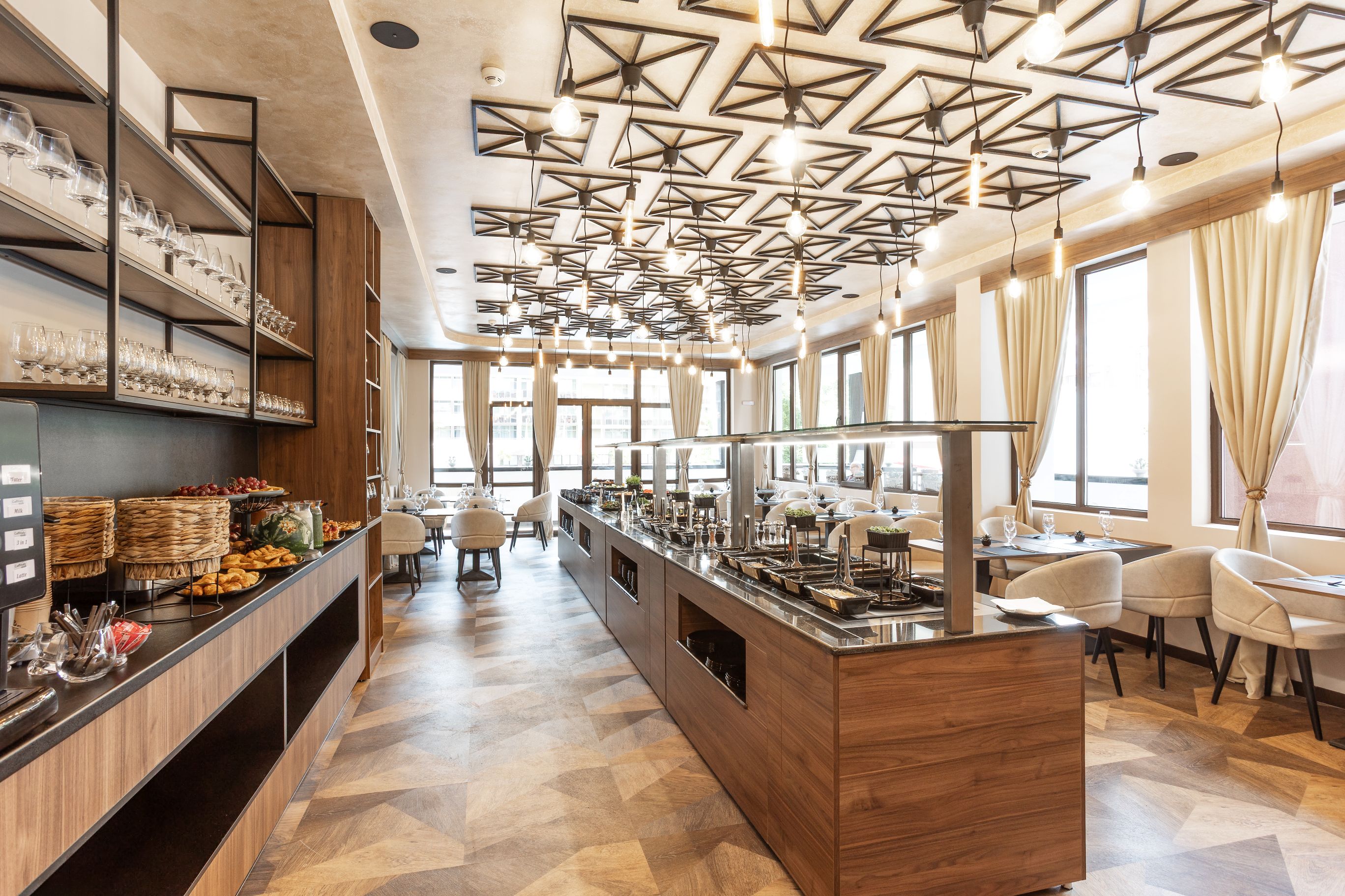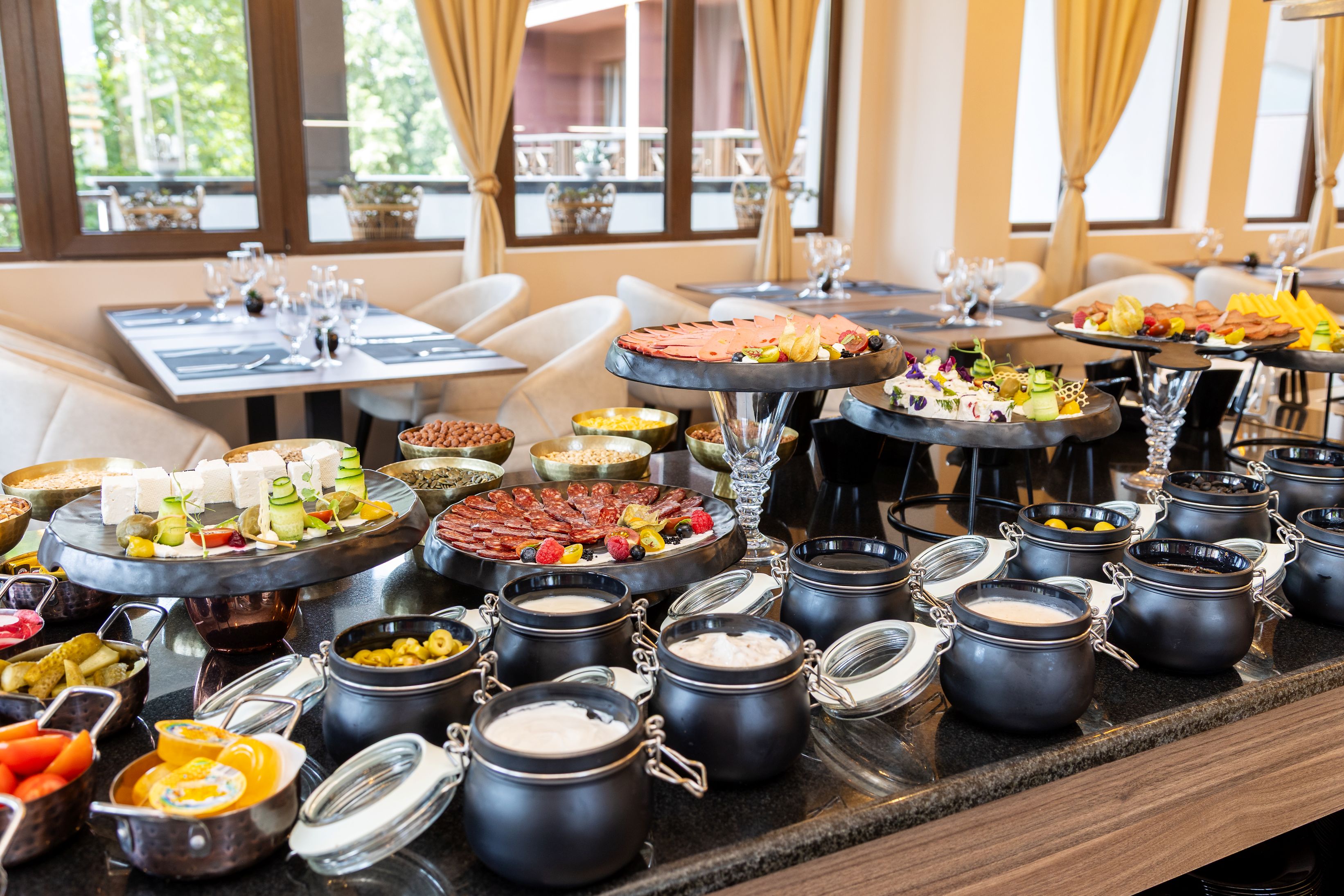 restaurant principal cu terasa si servire in stil bufet, 5 cine tematice/saptamana (cu specific bulgaresc, italian, asiatic, spaniol si cu fructe de mare), cooking show, bar in lobby, lounge bar, bar la piscina.