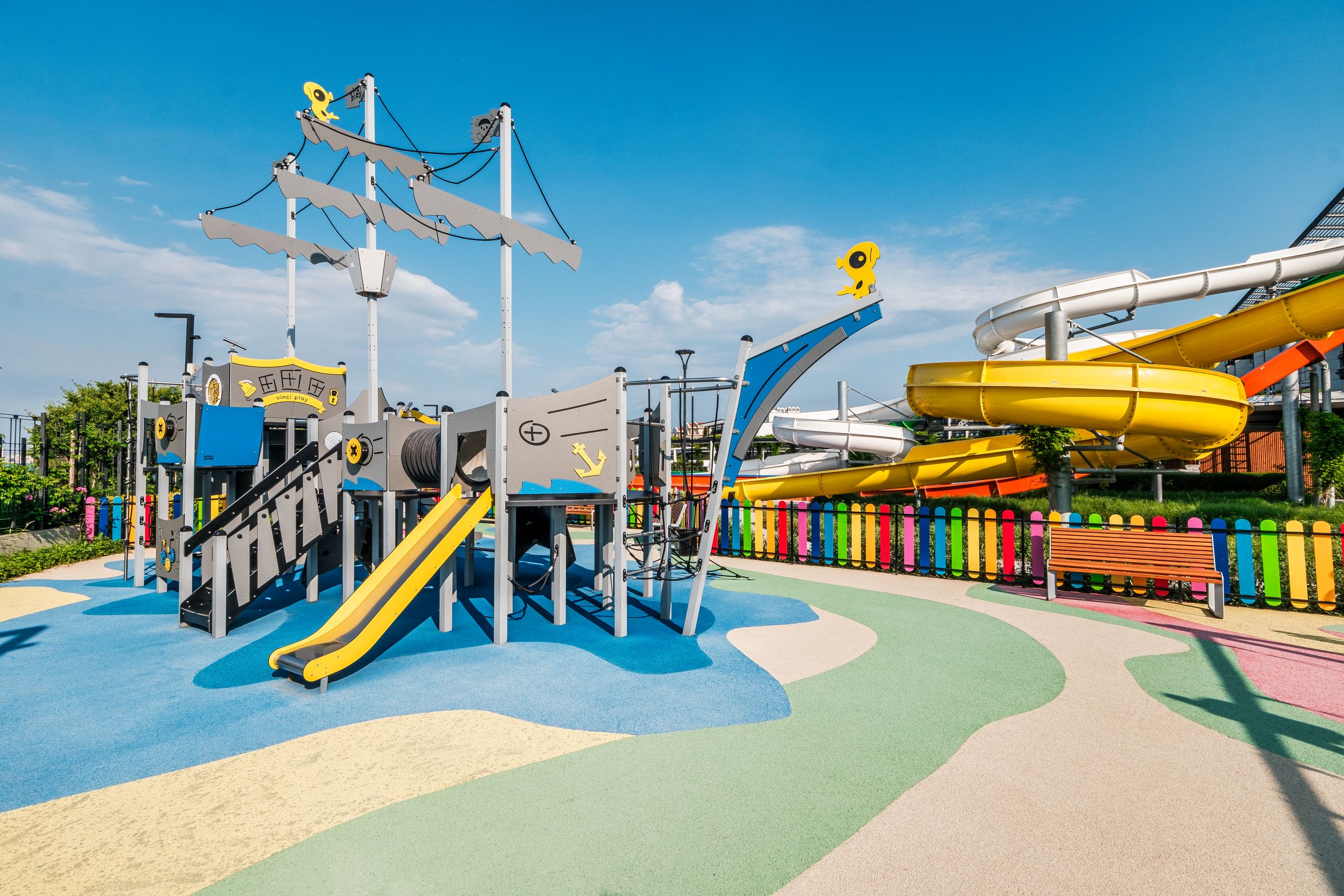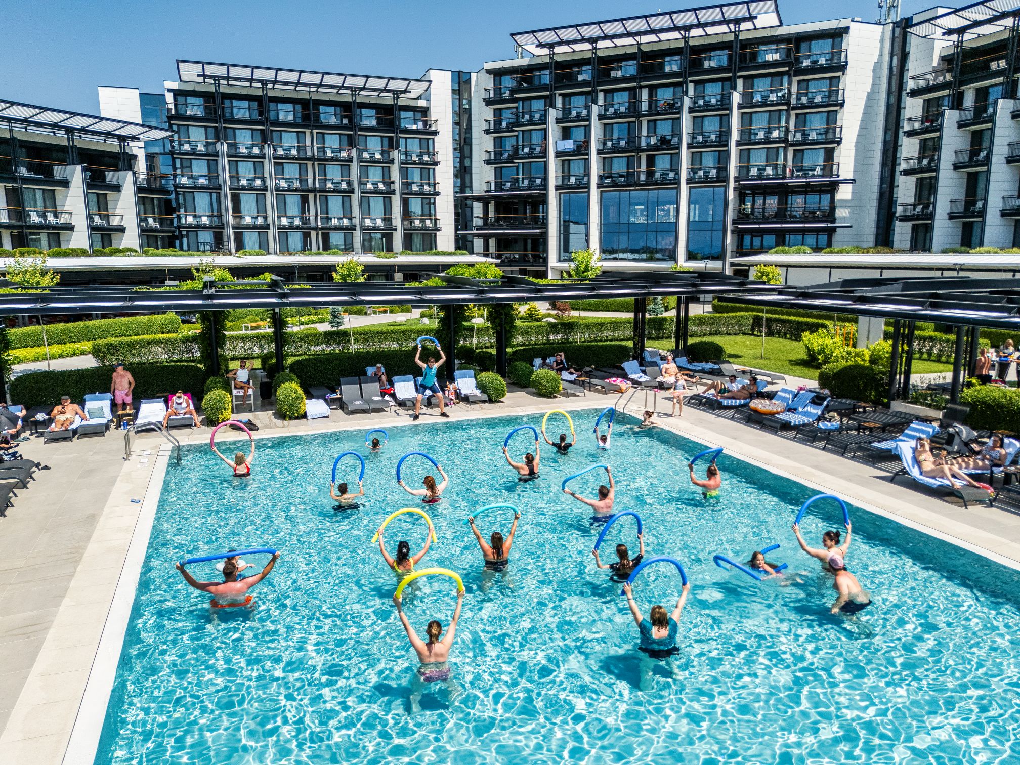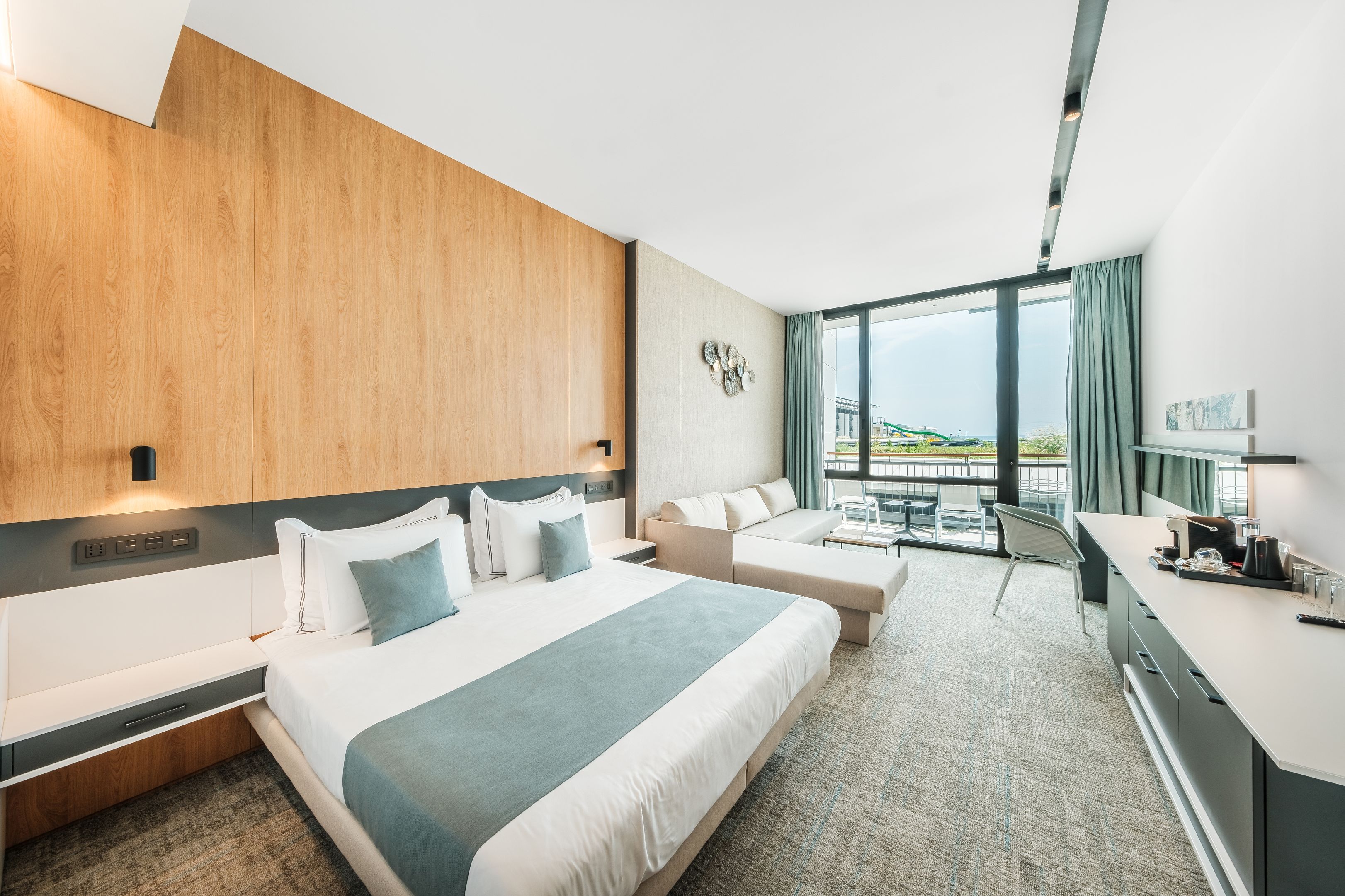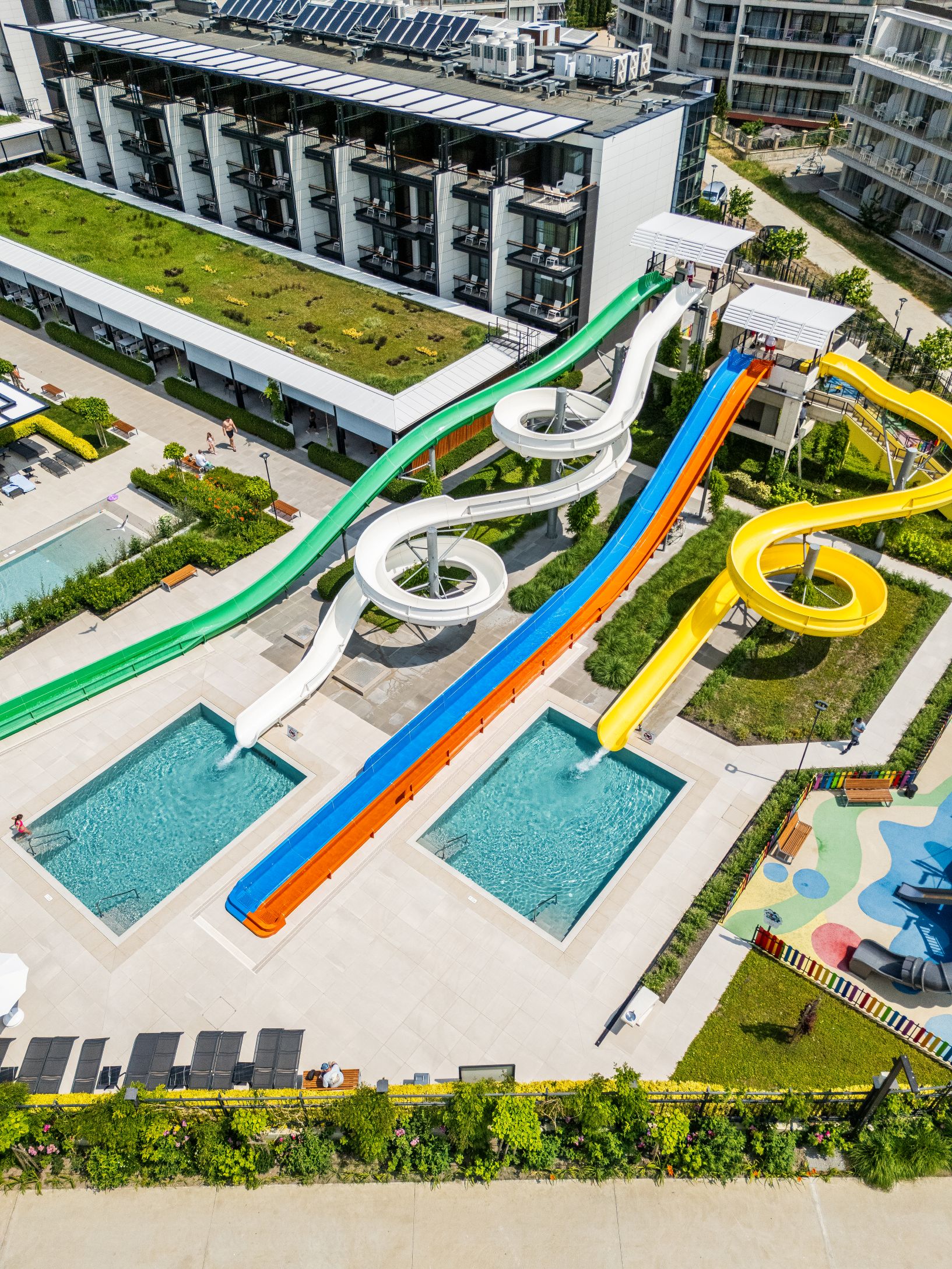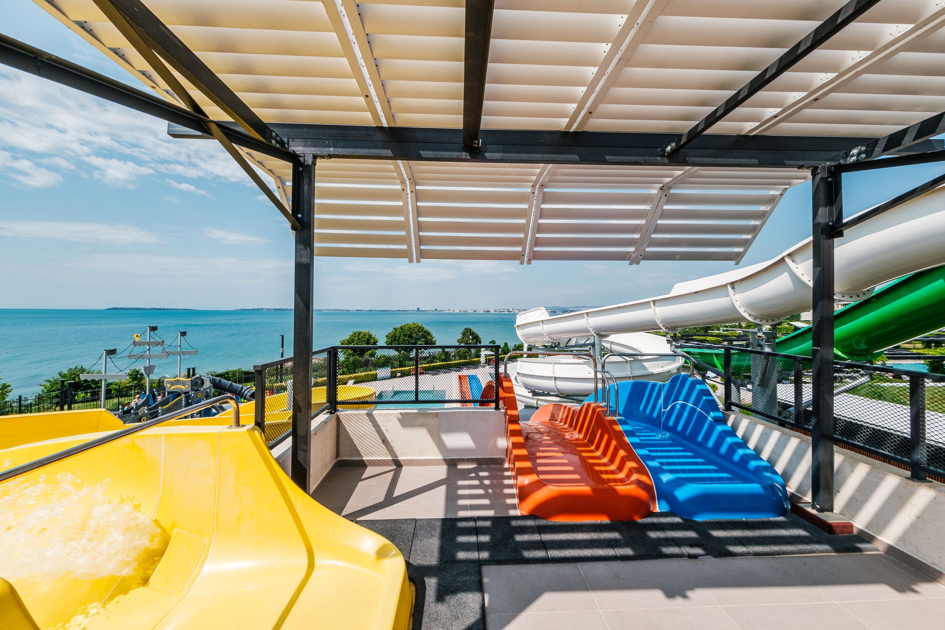 Aquapark cu 5 tobogane cu apa (inchis dupa 10 septembrie), piscina interioara cu sectiune pentru copii si 4 piscine exterioare (NOU: piscina exterioara incalzita 27 grade – exclusiv pentru adulti, piscine exterioare incalzite pentru copii), inchirieri auto, schimb valutar, facilitati pentru persoane cu mobilitate redusa.