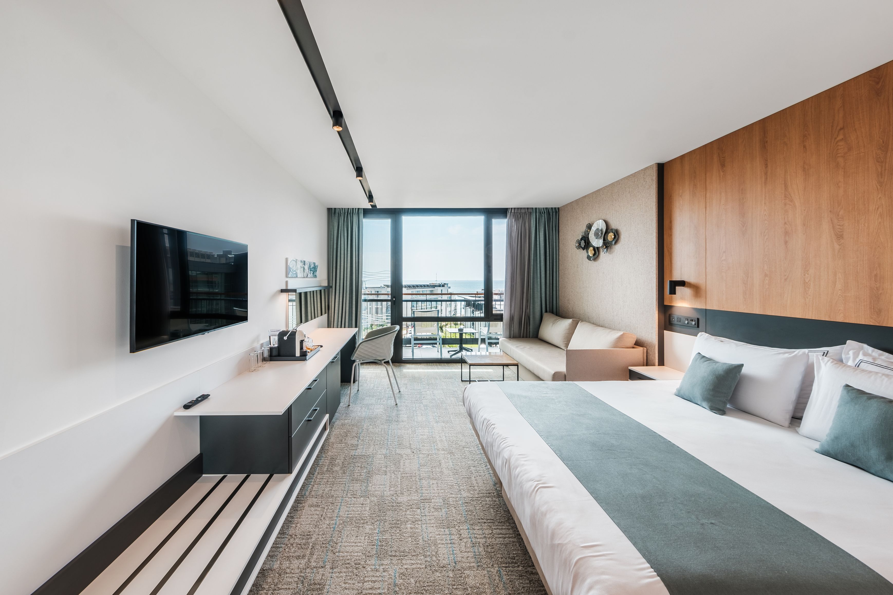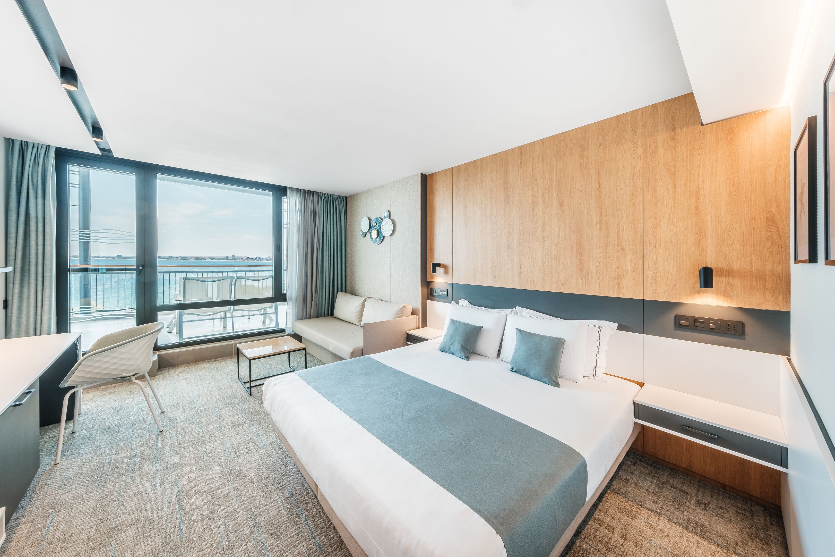 • Camera dubla cu terasa (30-35 mp) are un pat dublu (180×200) cm, o canapea (90×190), balcon de 14 mp si amplasare in zona mai linistita a hotelului, cu vedere la mare.