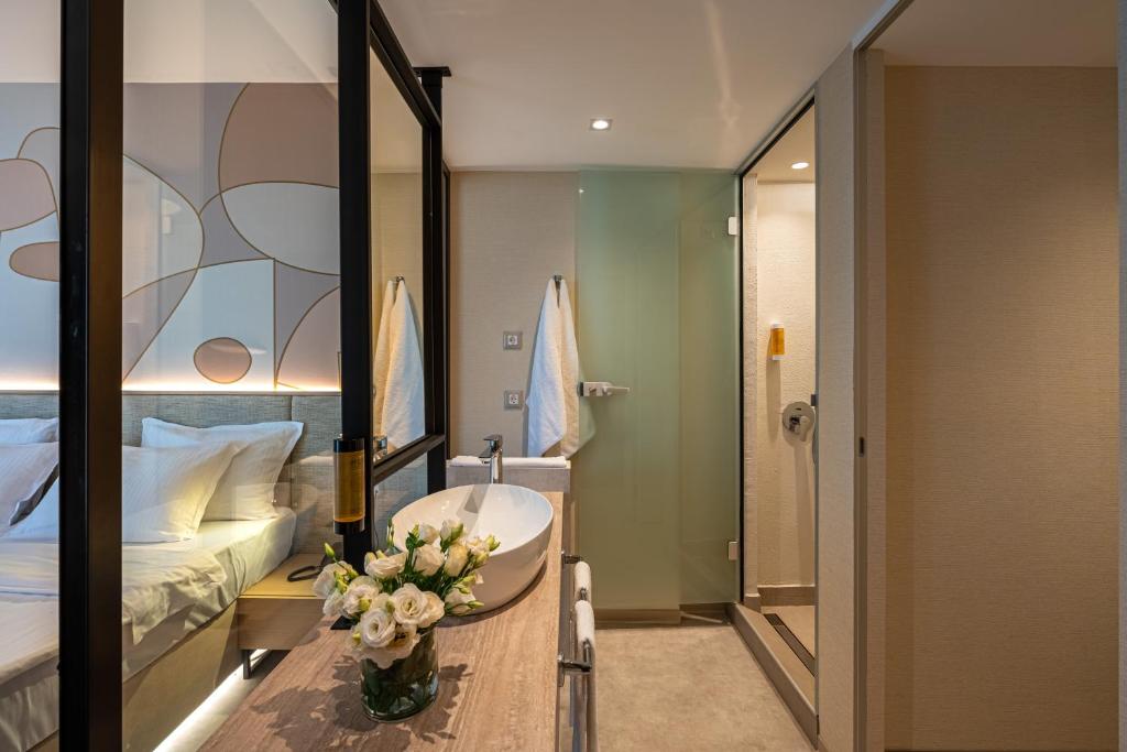 • Junior suite cu vedere la mare (aprox. 40 mp) dispune de doua paturi sau un pat dublu si un pat suplimentar (canapea). Nu au chicineta.